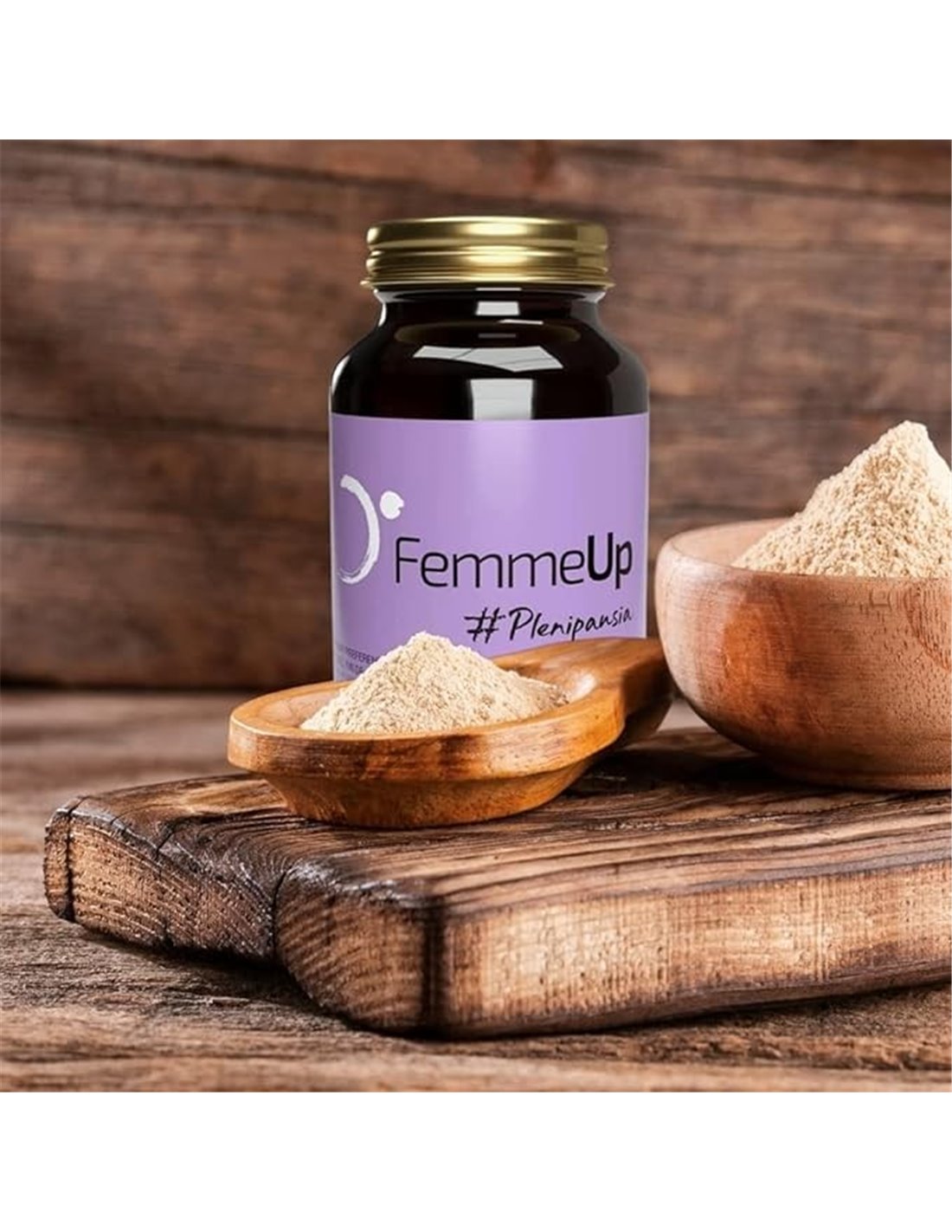 FEMMEUPFemmeUp Plenipausia es un complemento alimenticio con extractos de plantas adaptógenas para dar apoyo durante la menopausia. La Angelica sinensis, también conocida como Dong quai, destaca por su actividad como regulador hormonal. El trébol rojo también tiene actividad antioxidante que puede ser el resultado de la presencia de diferentes flavonoides y otros compuestos fenólicos como ácidos fenólicos, clovamidas y saponinas. La vitamina E contribuye a proteger las células del daño oxidativo. Este producto puede ser de utilidad frente a síntomas de la menopausia como sofocos, irritabilidad, y para el estado de ánimo. Producto 100% vegano.