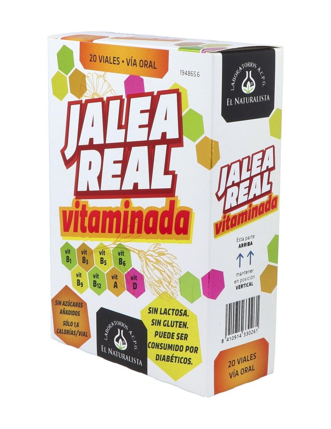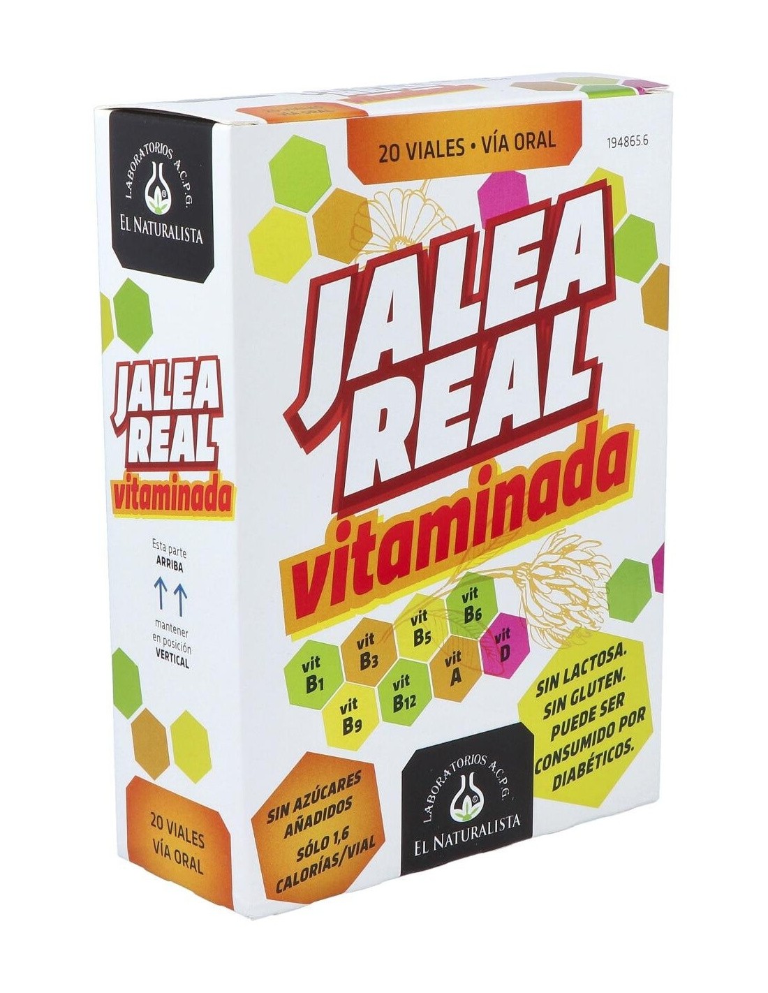 Complemento alimenticio compuesto por Jalea Real liofilizada y 8 Vitaminas: B1, B3, B5, B6, B9, B12, A y D. Puede ser consumido por diabéticos debido a su bajo contenido en azúcares totales (0,09 g/vial).