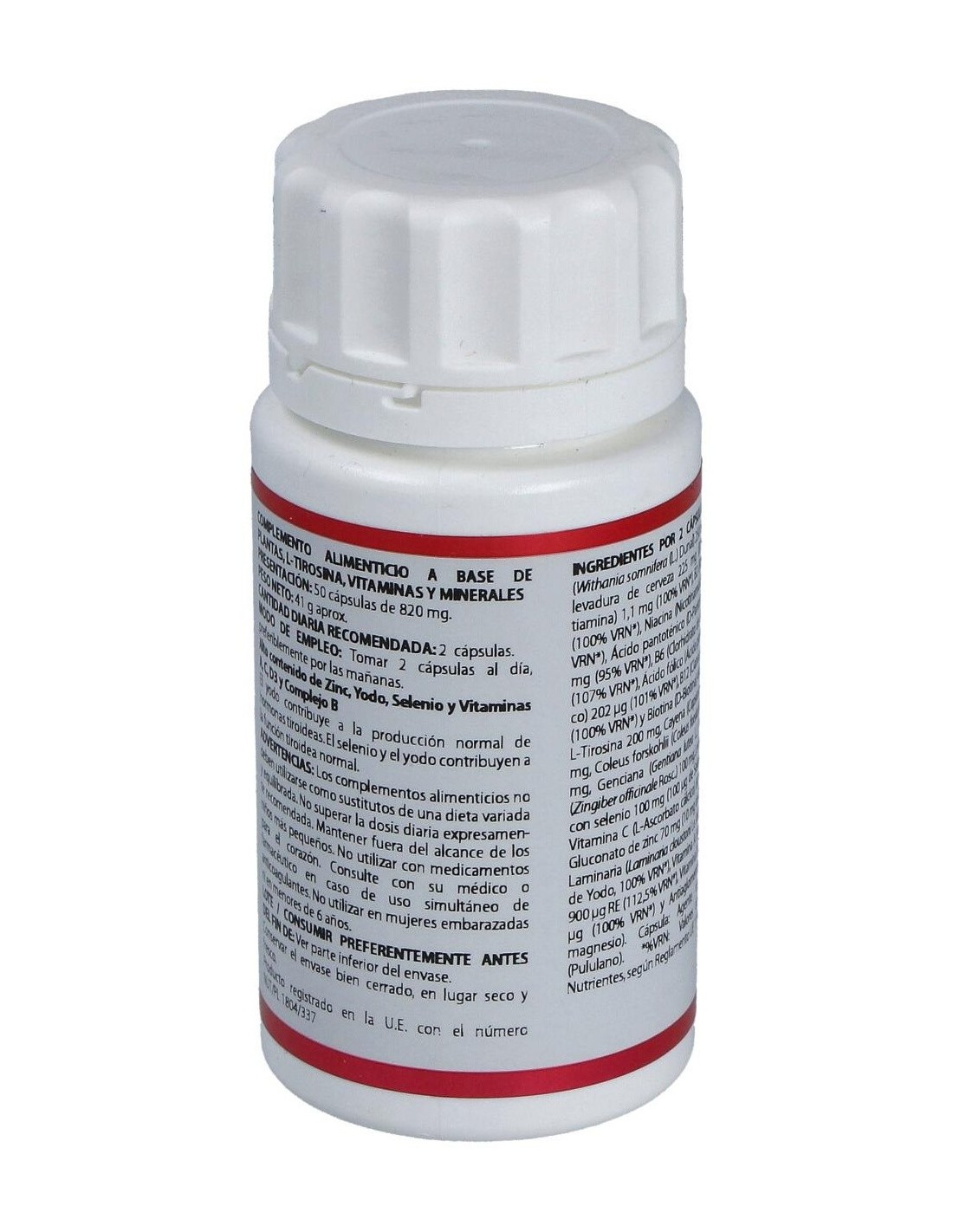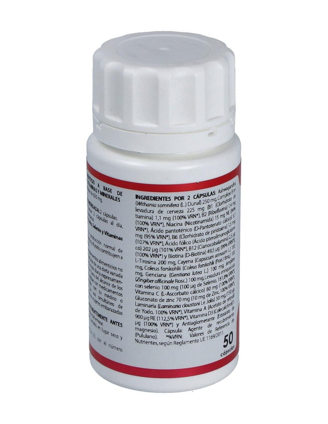 ASHWAGANDHA EXTRACTO SECO (WITHANIA SOMNÍFERA (L.) DUNAL, RAÍZ, =1,5% WHITANÓLIDOS), 125 MG; LYNSIDE® FORTE B100 (VITAMINAS DEL COMPLEJO B (VITAMINA B1 (TIAMINA CLORHIDRATO) 5.100 PPM, VITAMINA B2 (RIBOFLAVINA) 6.100 PPM, NIACINA 68.000 PPM, ÁCIDO PANTOTÉNICO (D-PANTOTENATO CÁLCICO) 25.400 PPM, VITAMINA B6 (PIRIDOXINA CLORHIDRATO) 6.700 PPM, D-BIOTINA 220 PPM, ÁCIDO FÓLICO 900 PPM, VITAMINA B12 (CIANOCOBALAMINA) 11 PPM) EN LEVADURA DE CERVEZA), 112,5 MG; L-TIROSINA, 100 MG; CAYENA POLVO (CAPSICUM ANNUUM L., FRUTO, 0,4% CAPSAICINOIDES TOTALES EXPRESADOS COMO CAPSAICINA), 50 MG; COLEUS FORSKOHLII EXTRACTO SECO (COLEUS FORSKOHLII (POIR.) BRIQ., PARTES AÉREAS, >10% FORSKOLINA), 50 MG; GENCIANA EXTRACTO SECO (GENTIANA LUTEA L., RAÍZ, RATIO 4:1), 50 MG; JENGIBRE EXTRACTO SECO (ZINGIBER OFFICINALE ROSCOE, RAÍZ, 5% GINGEROLES), 50 MG; LEVADURA ENRIQUECIDA CON SELENIO (1.000 PPM SELENIO), 50 MG; ASCORBATO DE CALCIO (VITAMINA C, 82,64 % ÁCIDO L-ASCÓRBICO), 48,4 MG; GLUCONATO DE ZINC (14,35% ZINC), 35 MG; KELP EXTRACTO SECO (LAMINARIA DIGITATA (HUDS.) J.V.LAMOUR., TALO, 1% YODO), 7,5 MG; ACETATO DE RETINOL (VITAMINA A, 150 µG RE/MG), 3 MG; COLECALCIFEROL (2,5 µG VITAMINA D3/MG), 1 MG. EXCIPIENTE TECNOLÓGICO: ESTEARATO DE MAGNESIO (ANTIAGLOMERANTE), C.S. ENVOLTURA: POLISACÁRIDO DE ORIGEN VEGETAL (PULULANO).