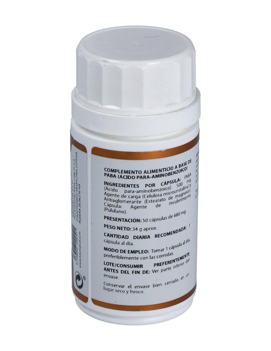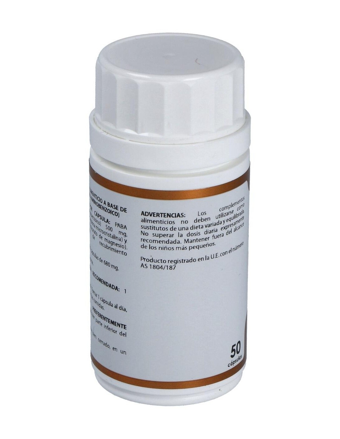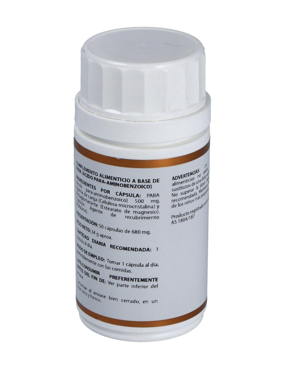 El PABA, ácido para aminobenzoico, es considerado parte del complejo vitamínico B. El PABA estimula la flora intestinal y favorece la producción de ácido fólico, que a su vez ayuda a la producción de ácido pantoténico (Vitamina B5). El PABA actúa como coenzima en la ruptura y catabolismo de las proteínas y en la formación de los glóbulos rojos.Ingredientes activos por cápsula:500 mg de PABA (ácido para-aminobenzoico).Modo de empleo:Tomar 1 cápsula al día preferentemente con una comida.Presentación:Bote de 50 cápsulas.