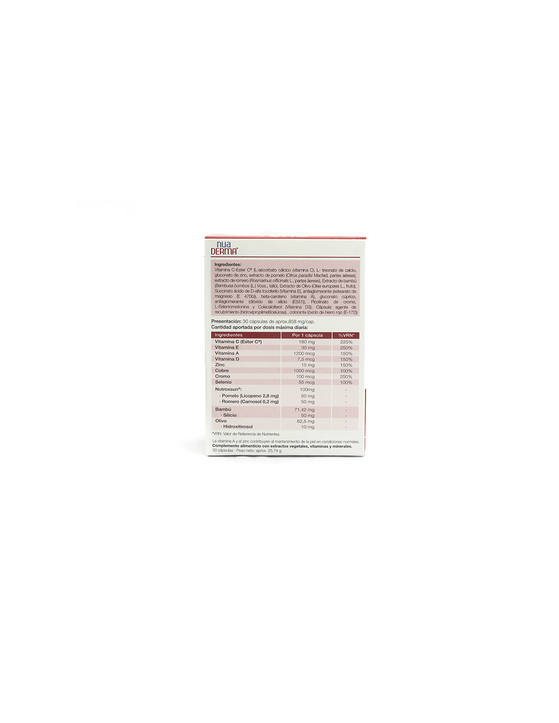 Olivo (hidroxitirosol), Nutroxsun (Pomelo y Romero), Vitamina C, Vitamina D3, Vitamina E, Vitamina A como betacaroteno, Bambú (silicio orgánico), Zinc, Selenio, Cobre, Cromo.