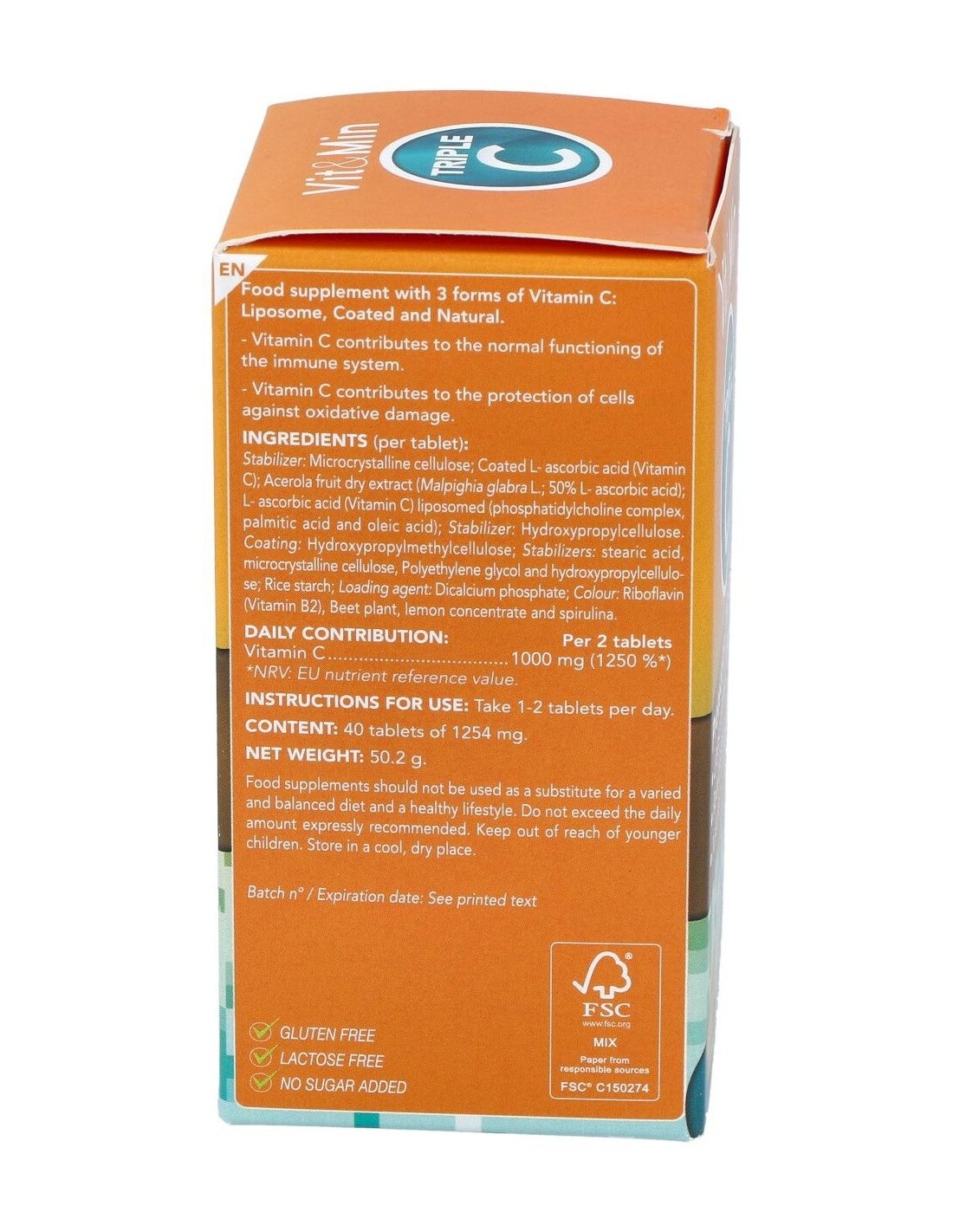 Estabilizante: Celulosa microcristalina; ácido L-ascórbico (Vitamina C) recubierto (Etilcelulosa); Extracto seco de fruto de Acerola (Malpighia glabra L.; 50% de ácido L- ascórbico); ácido L- ascórbico (Vitamina C) liposomado (complejo de Fosfatidilcolina, ácido palmítico y ácido oleico) Soja; Estabilizante: Hidroxipropilcelulosa. Recubrimiento: Hidroxipropilmetilcelulosa; Estabilizantes: ácido esteárico, celulosa microcristalina, Polietilenglicol e Hidroxipropilcelulosa; Almidón de arroz; Agente de carga: Fosfato dicálcico; Colorantes: Riboflavina (vitamina B2), Planta de remolacha, concentrado de limón, espirulina.