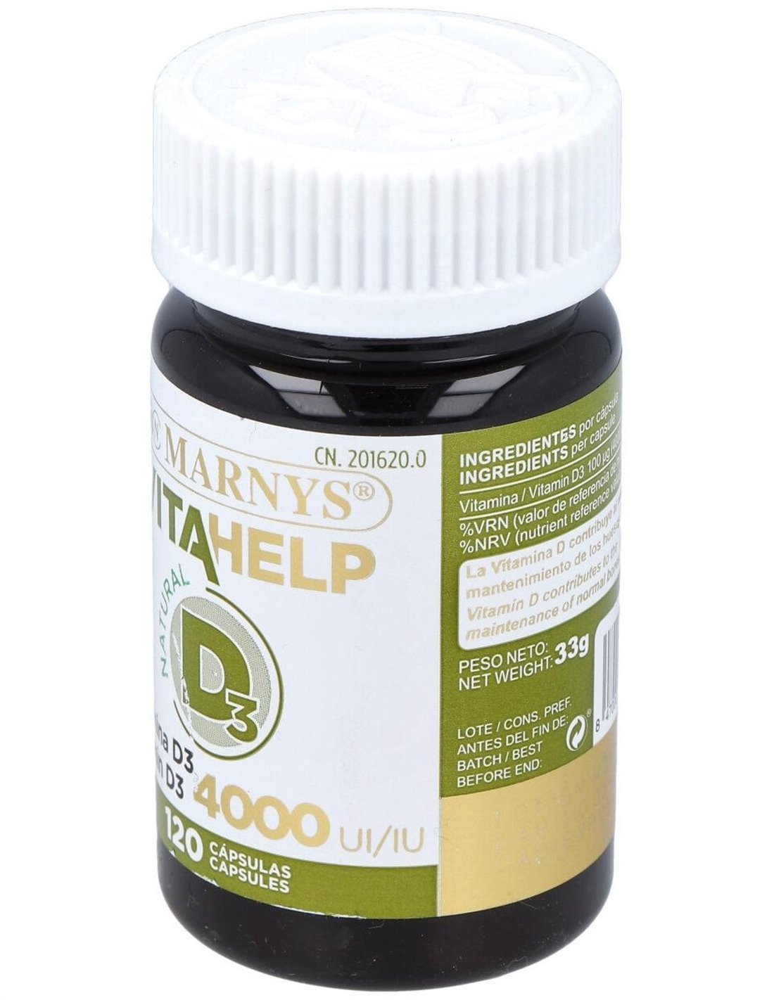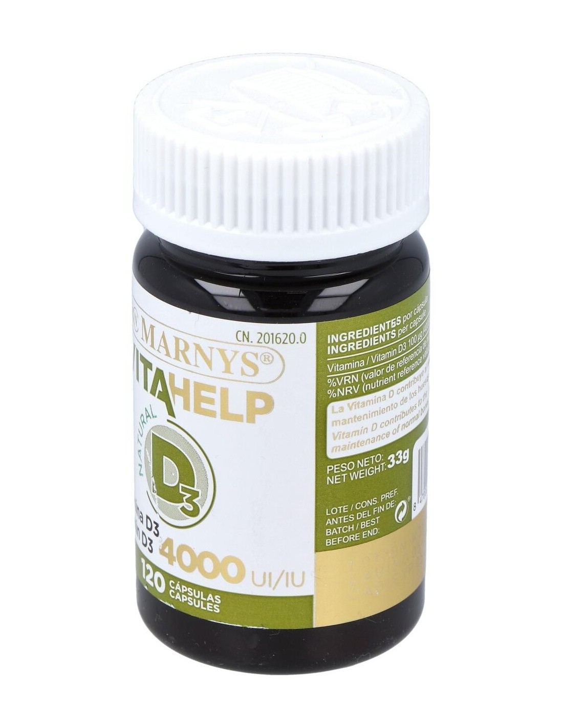 Vitahelp Vitamina D 4000Ui 120Perlas de Marnys es un suplemento para personas que buscan mantener niveles adecuados de vitamina D, aportando una dosis concentrada en perlas fáciles de consumir.