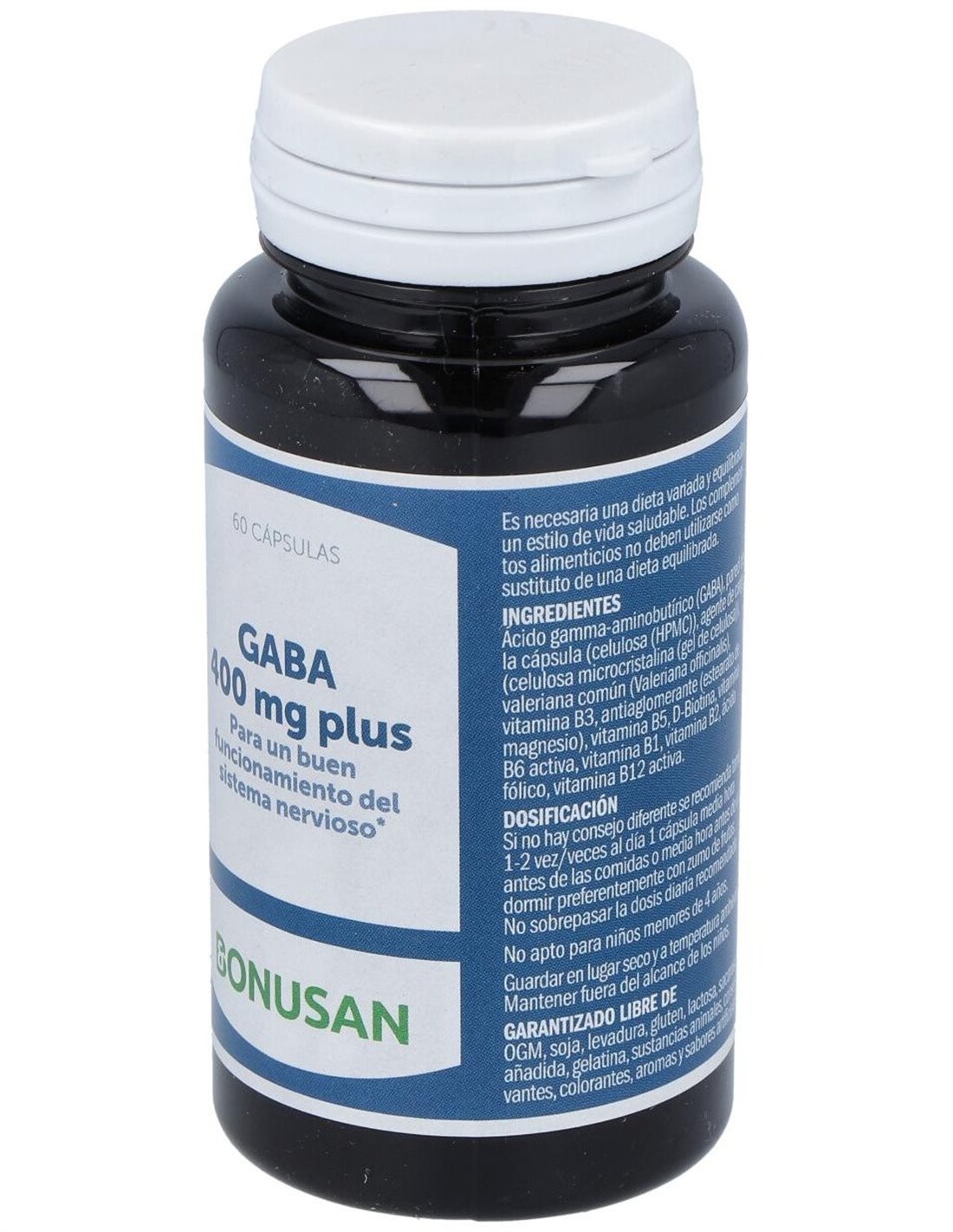 Ingredientes:Ácido gamma-aminobutírico (GABA), pared de la cápsula (celulosa (HPMC)), bisglicinato de magnesio, valeriana común (Valeriana officinalis), vitamina B3, extracto de arroz, vitamina B5, D-biotina, vitamina B1, vitamina B2, vitamina B6, folato (Quatrefolic®), vitamin B12. Modo de empleo:Tomar de 1 a 2 veces al día 1 cápsula al menos media hora antes de las comidas o media hora antes de acostarse.Presentación:Bote de 60 cápsulas.