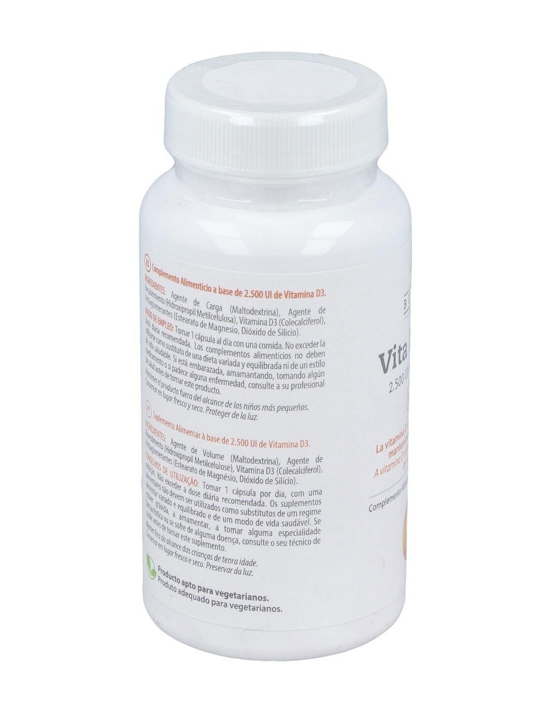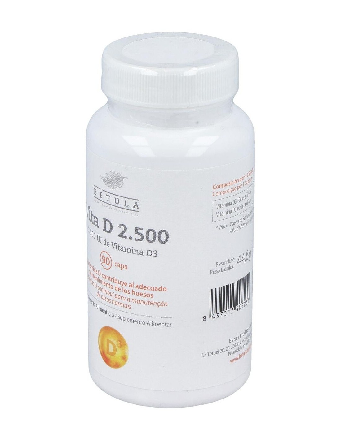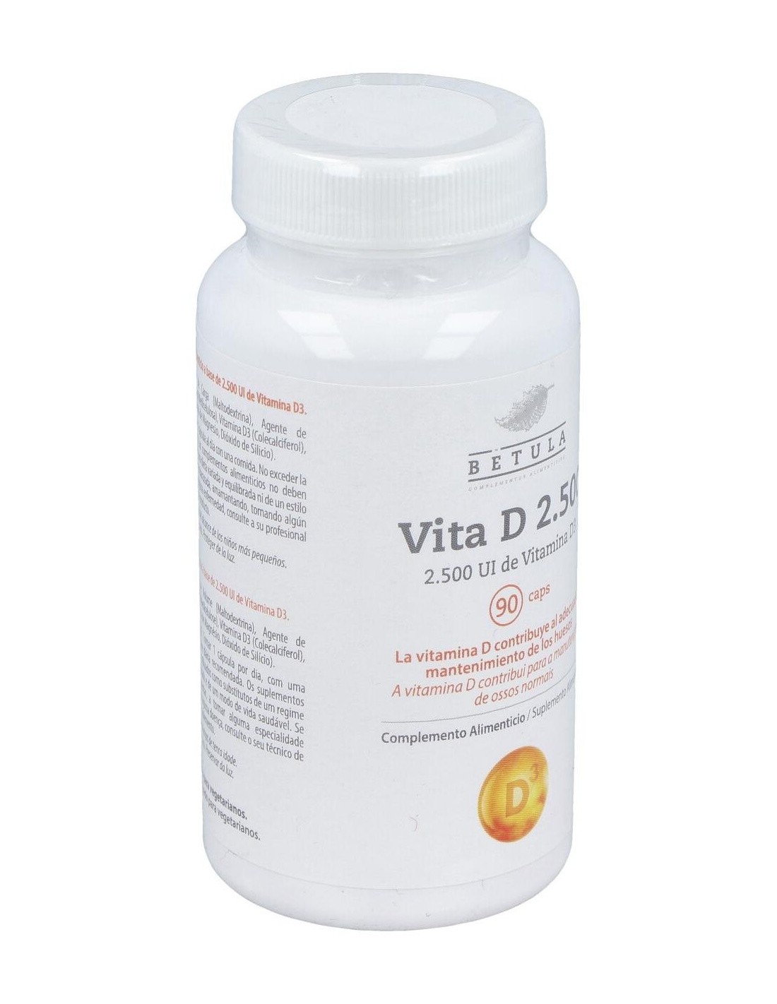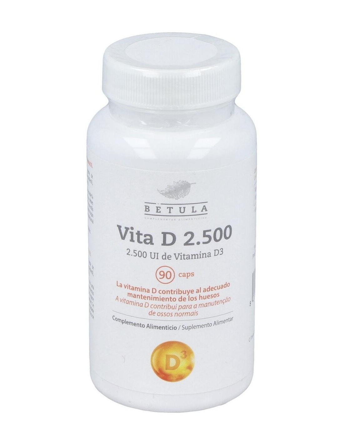 La vitamina D es básica para huesos y dientes. Participa en la absorción intestinal del calcio, favorece su reabsorción renal y es necesaria para una correcta matriz de huesos y dientes.En embarazo y lactancia ayuda a correcta calcificación, ofrece protección inmunitaria y previene enfermedades tópicas y autoinmunes. Potencia inmunidad innata y modula respuesta inflamatoria. Su suplementación reduce un 12 % las infecciones respiratorias agudas (y hasta un 70 % en casos de deficiencia severa).Es importante para el mantenimiento de la fuerza muscular y el sentido del equilibrio. Su suplementación disminuye riesgo de caídas en mayores. Niveles adecuados ayudan a controlar procesos inflamatorios y a mejorar protección frente a desórdenes cardiovasculares y metabólicosComposición activa por cápsula:62,5 mcg de vitamina D3 (colecalciferol)(2.500 UI).Ingredientes:Agente de Carga (Maltodextrina), Agente de Recubrimiento (Hidroxipropil Metilcelulosa), Vitamina D3 (Colecalciferol), Antiaglomerantes (Estearato de Magnesio, Dióxido de Silicio).Modo de empleo:Tomar de 1 cápsula al día, con una comida.Presentación:Envase de 90 cápsulas.Recomendaciones y advertencias:Apto para vegetarianos.