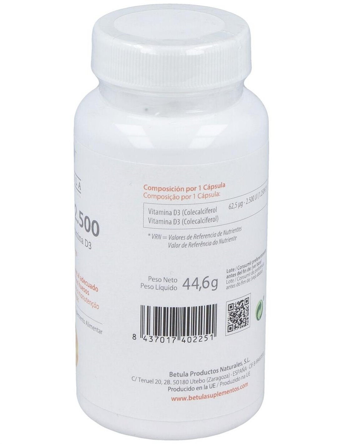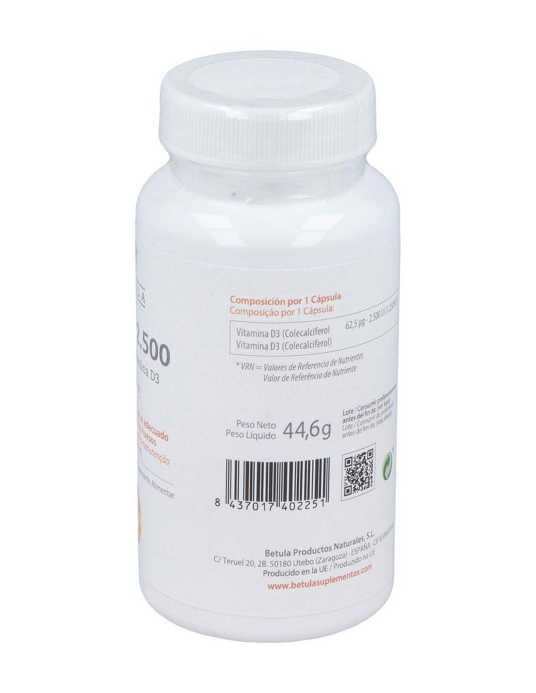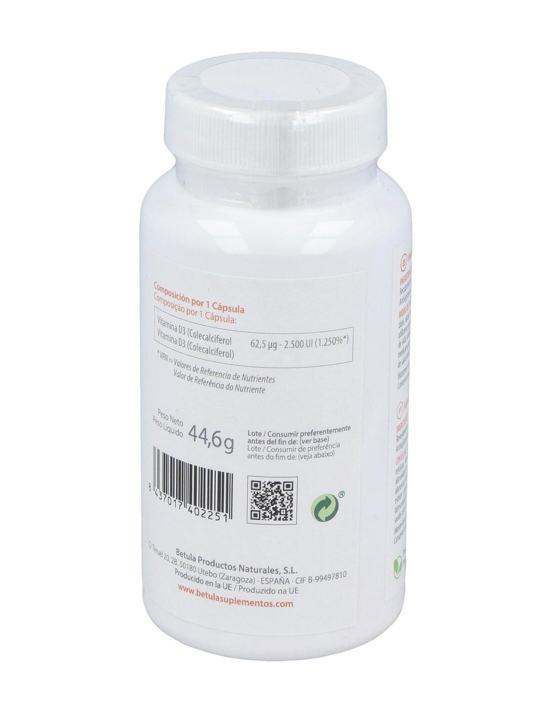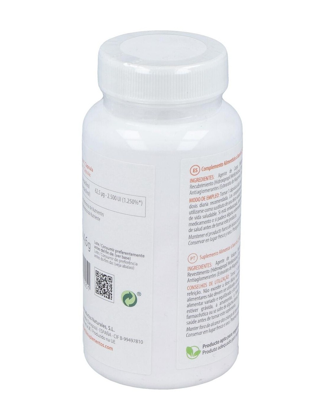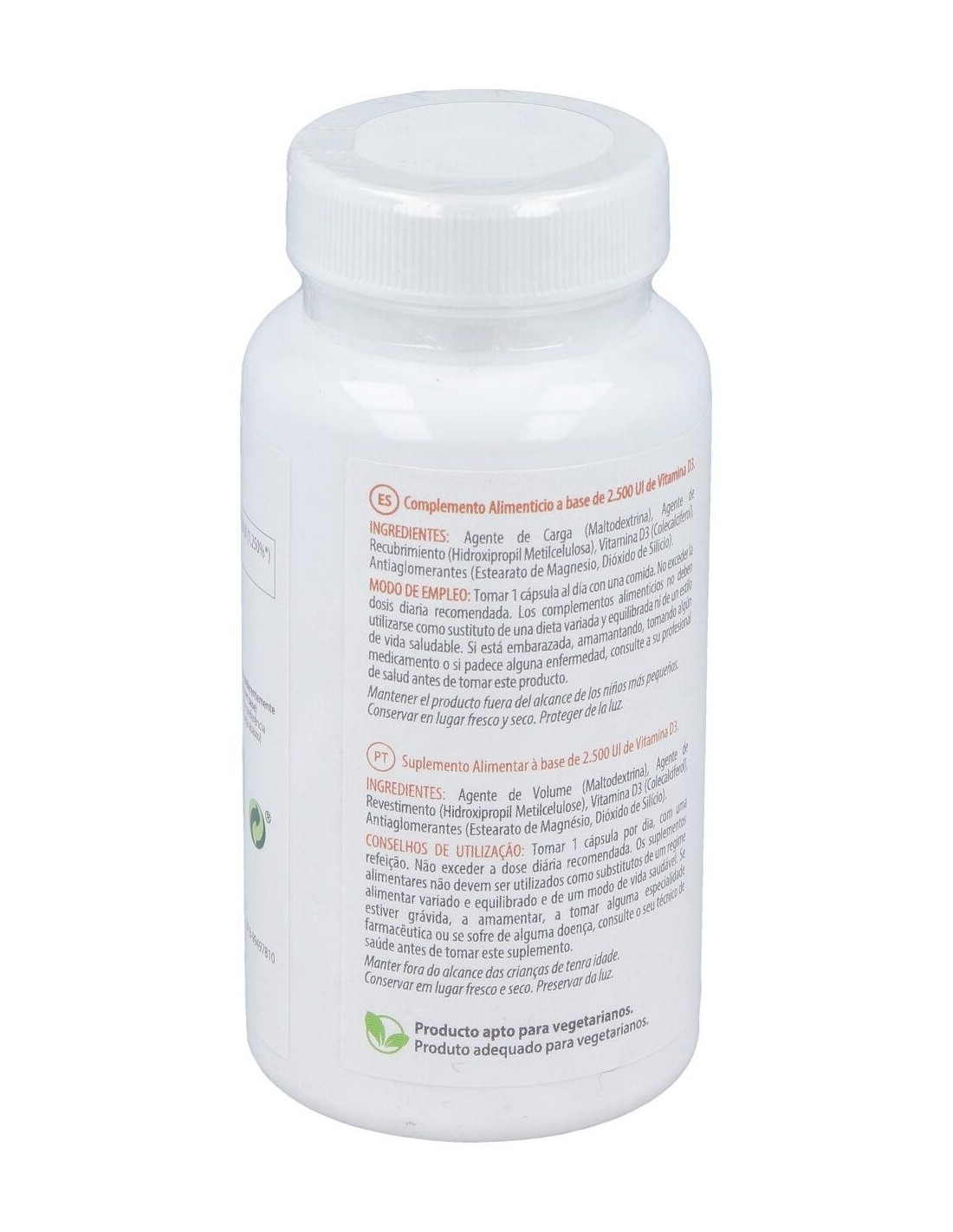 La vitamina D es básica para huesos y dientes. Participa en la absorción intestinal del calcio, favorece su reabsorción renal y es necesaria para una correcta matriz de huesos y dientes.En embarazo y lactancia ayuda a correcta calcificación, ofrece protección inmunitaria y previene enfermedades tópicas y autoinmunes. Potencia inmunidad innata y modula respuesta inflamatoria. Su suplementación reduce un 12 % las infecciones respiratorias agudas (y hasta un 70 % en casos de deficiencia severa).Es importante para el mantenimiento de la fuerza muscular y el sentido del equilibrio. Su suplementación disminuye riesgo de caídas en mayores. Niveles adecuados ayudan a controlar procesos inflamatorios y a mejorar protección frente a desórdenes cardiovasculares y metabólicosComposición activa por cápsula:62,5 mcg de vitamina D3 (colecalciferol)(2.500 UI).Ingredientes:Agente de Carga (Maltodextrina), Agente de Recubrimiento (Hidroxipropil Metilcelulosa), Vitamina D3 (Colecalciferol), Antiaglomerantes (Estearato de Magnesio, Dióxido de Silicio).Modo de empleo:Tomar de 1 cápsula al día, con una comida.Presentación:Envase de 90 cápsulas.Recomendaciones y advertencias:Apto para vegetarianos.