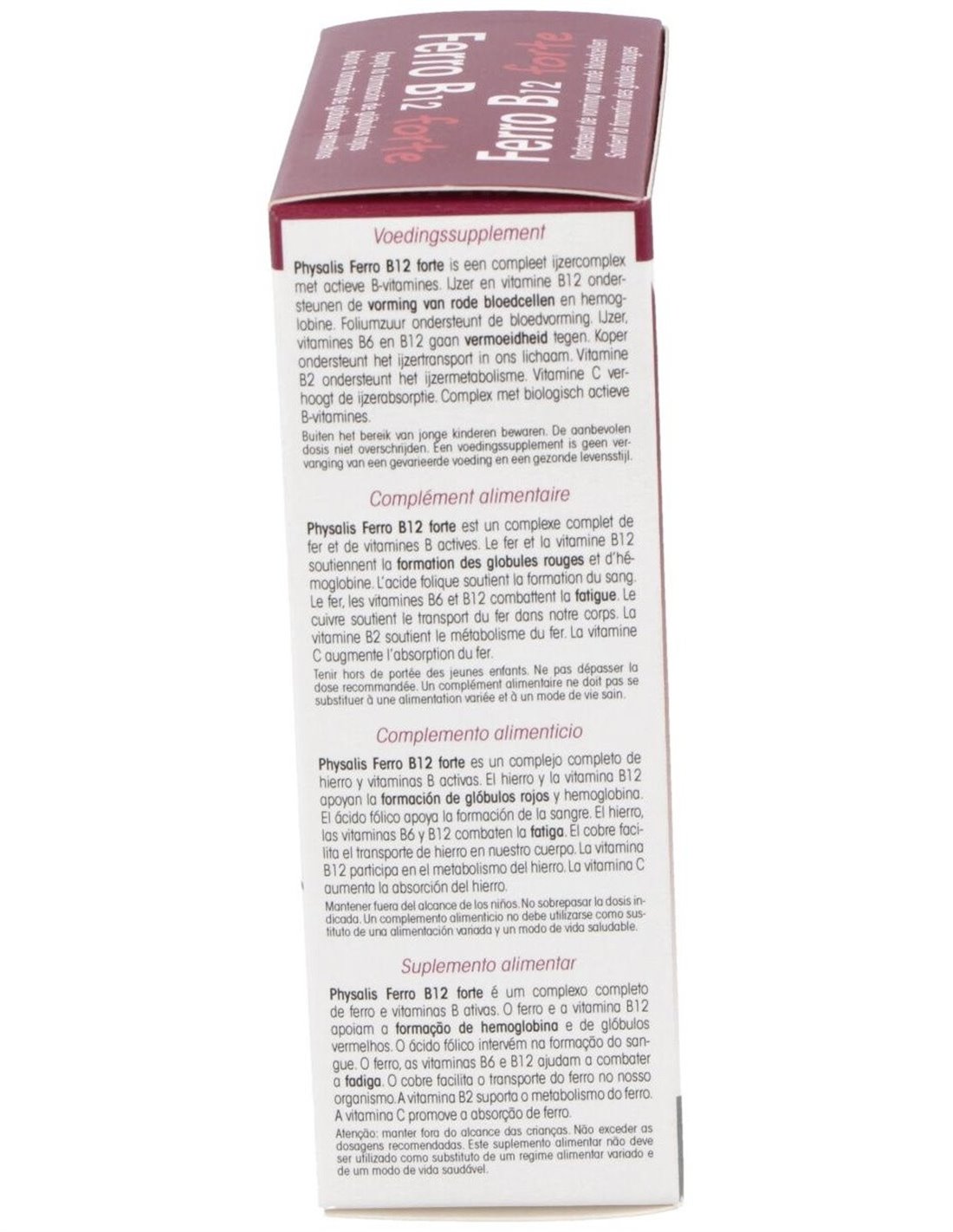 El Ferro B12 Forte de Physalis es un suplemento nutricional para personas con necesidades de hierro y vitamina B12, que contribuye al mantenimiento de niveles adecuados de energía gracias a su fórmula combinada de hierro y vitamina B12.