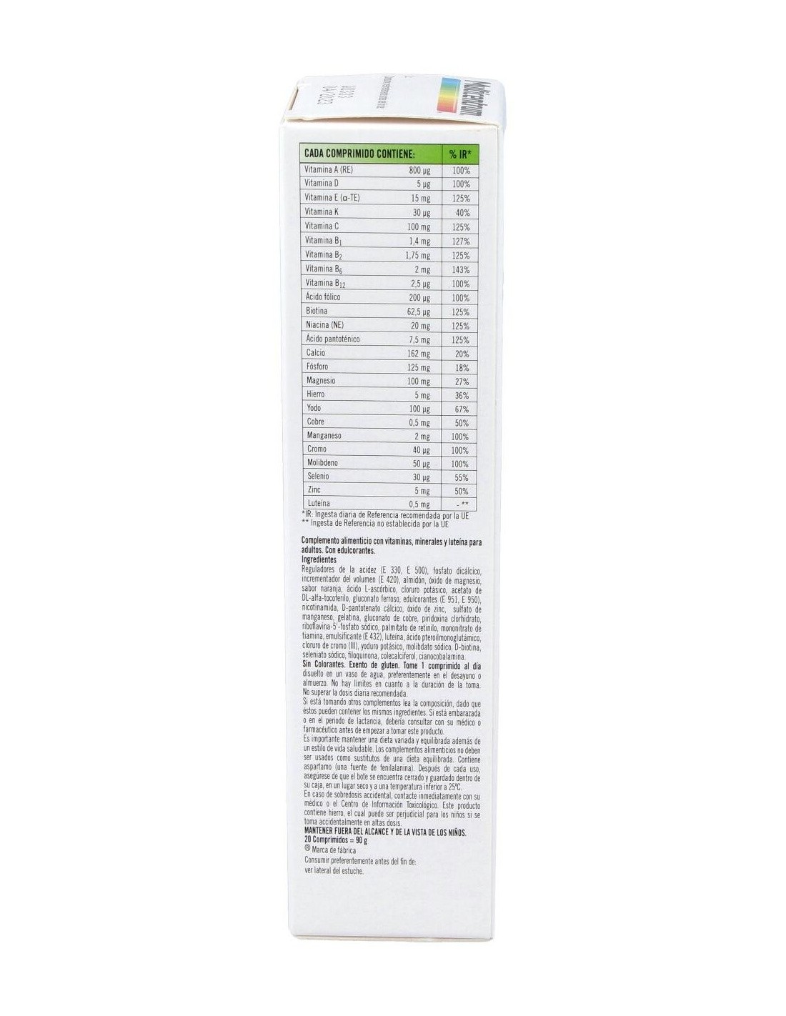 Reguladores de la acidez (E 330, E 500), fosfato dicálcico, incrementador del volumen (E 420), almidón, óxido de magnesio, sabor naranja, ácido L-ascórbico, cloruro potásico, acetato de DL-alfa-tocoferilo, gluconato ferroso, edulcorantes (E 951, E 950), nicotinamida, D-pantotenato cálcico, óxido de zinc, sulfato de manganeso, gelatina, gluconato de cobre, piridoxina clorhidrato, riboavina-5´-fosfato sódico, palmitato de retinilo, mononitrato de tiamina, emulsicante (E 432), luteína, ácido pteroilmonoglutámico, cloruro de cromo (III), yoduro potásico, molibdato sódico, D-biotina, seleniato sódico, filoquinona, colecalciferol, cianocobalamina.