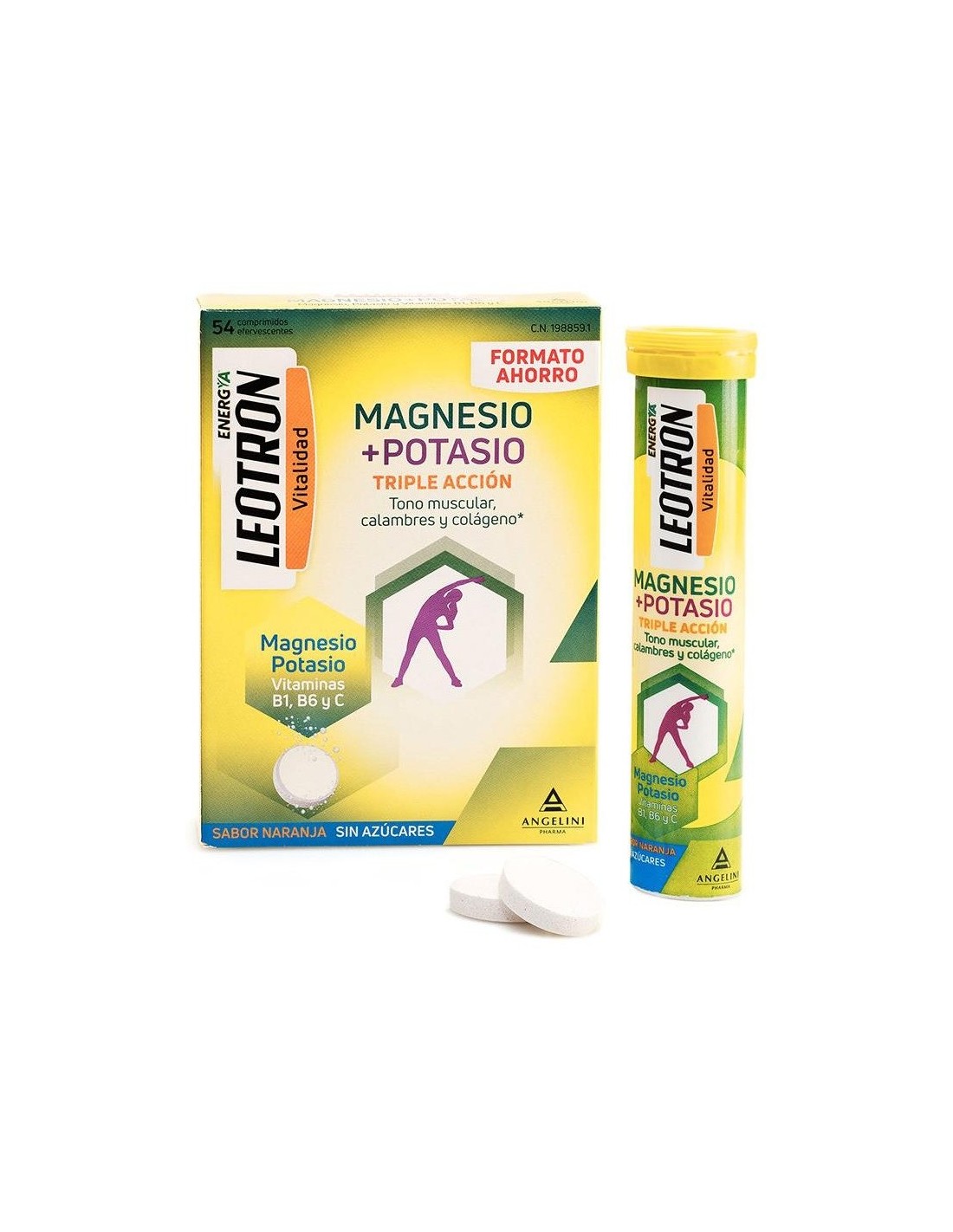 LEOTRONComprimidos efervescentes de sabor naranja y sin azúcares con triple acción. El magnesio y el potasio contribuyen al funcionamiento normal de los músculos. El magnesio ayuda a la síntesis proteica normal y al equilibrio electrolítico. La vitamina C contribuye a la formación normal de colágeno. La vitamina B6 ayuda al metabolismo normal de las proteínas.