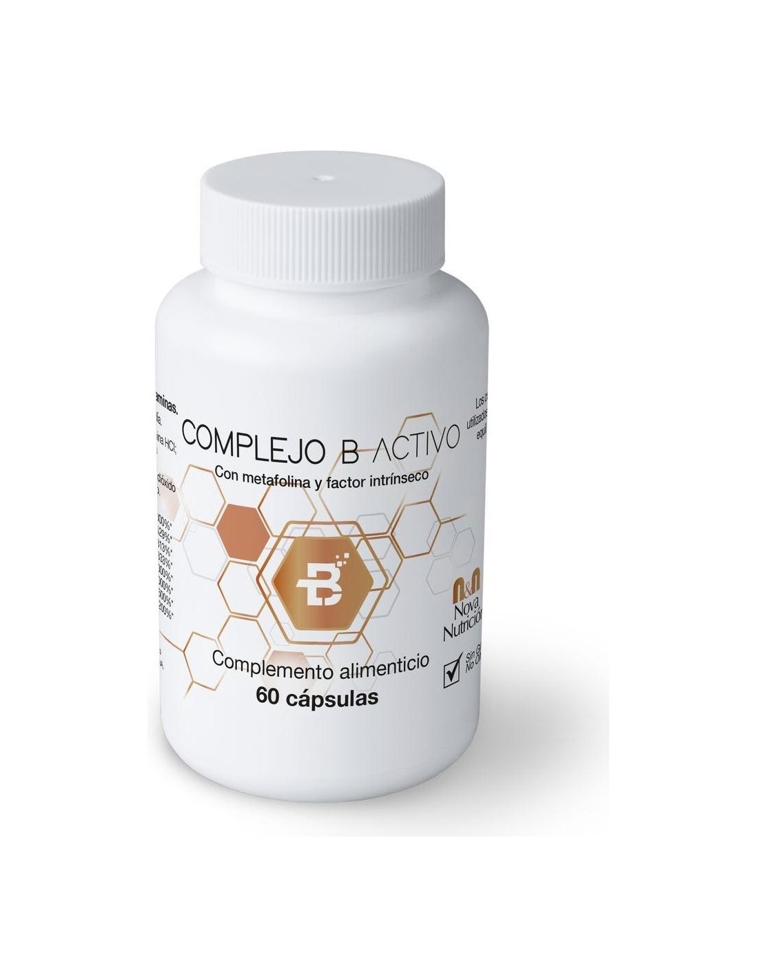 N&N NOVA NUTRICIONComplejo B activo es un complemento alimenticio a base de vitaminas del grupo B, y factor intrínseco. Proporciona vitaminas del grupo B esenciales junto con factor intrínseco, indispensable para la correcta absorción de la vitamina B12 en el íleon. Además, contiene ácido fólico en su forma metilada, esto es, activa, bajo la forma patentada Metafolin® (L-metifolato de calcio). Las vitaminas del grupo B son necesarias para el normal funcionamiento del metabolismo. Actúan como cofactores o coenzimas, o son sus precursores. Contribuyen al metabolismo energético normal (B1, B2, B3, B5, B6, B12 y Biotina), al metabolismo normal del sistema nervioso (B1, B2,B3, B6, B12, Biotina y Folato), a la función psicológica normal (B1, B3, B6, B12, Biotina y Folato). Ayudan a disminuir el cansancio y la fatiga (B1, B2, B3, B5, B6, B12 y Folato). Adultos mayores de 17 años.