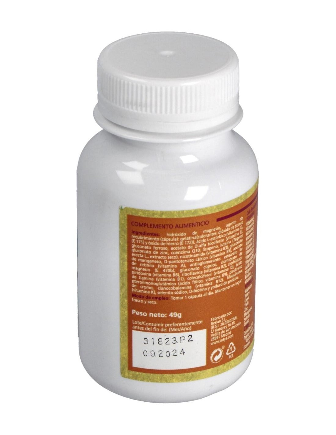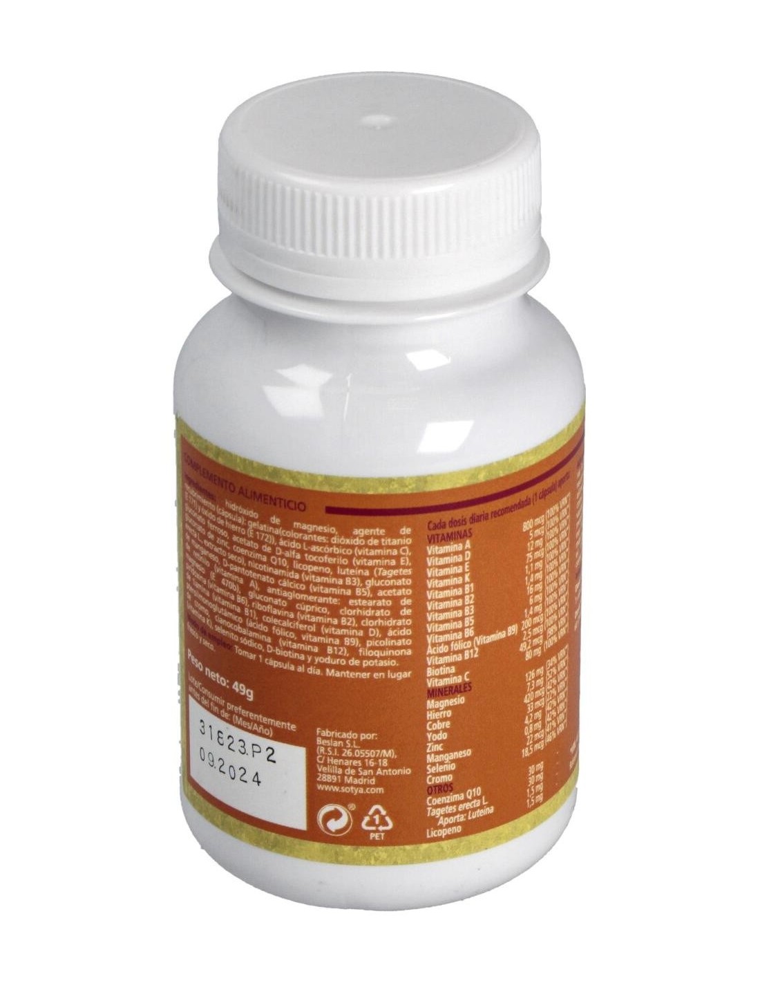 Este multivitamínico está elaborado con ingredientes seleccionados para asegurar una composición estable y segura. Su formato en cápsulas permite una absorción adecuada y una administración práctica en el día a día.