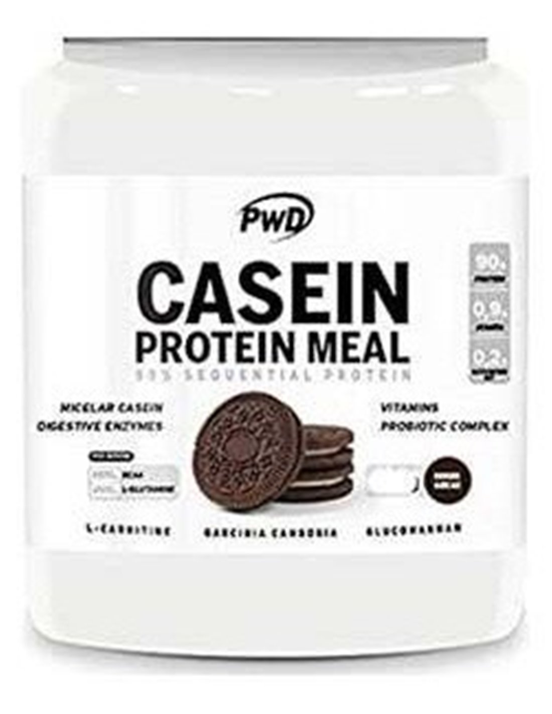 Aislado de proteínas de leche (80% caseína micelar/ 20% aislado de suero, emulgente (lecitina de soja)), aroma de galleta, galleta de cacao molida (1,8%) (harina de trigo, azúcar, grasa vegetal, grasa, cacao desgrasado, bicarbonato sódico, cloruro sódico, carragenato y goma guar), glucomanano (Amorphophallus konjac Koch), Cacao desgrasado en polvo (1,3%), L-Carnitina tartrato, Extracto seco de Garcinia cambogia (Garcinia cambogia (Gaernt) Desr., 60% Ác. Hidroxicítrico), espesantes (goma guar, goma xantana y carragenato), edulcorante (sucralosa), premix de vitaminas (ácido L-ascórbico, tiamina clorhidrato, riboflavina, nicotinamida, D-pantotenato de calcio, piridoxina clorhidrato, cianocobalamina, ácido pteroilmonoglutámico, D-biotina, D-alfa tocoferol acetato), complejo multi enzimático Digezyme® (maltodextrina, alfa amilasa, proteasa neutra, celulasa, beta-D- galactosidasa y lipasa) y mix probiótico (Lactobacillus acidophylus, Bifidobacterium longum, Bifidobacterium bifidum, Bifidobacterium lactis, maltodextrina, antiaglomerante (estearato de magnesio) y fructooligosacáridos).