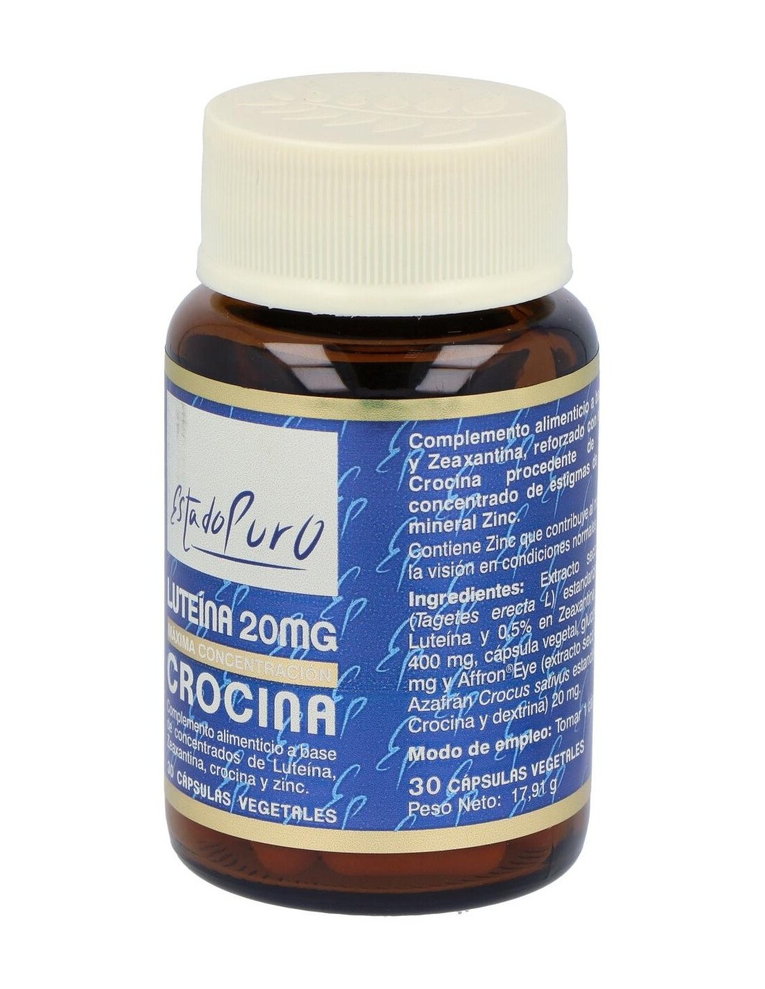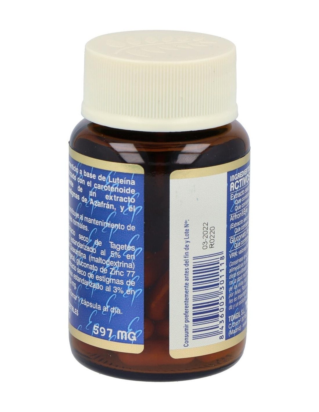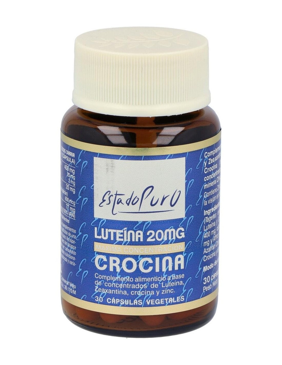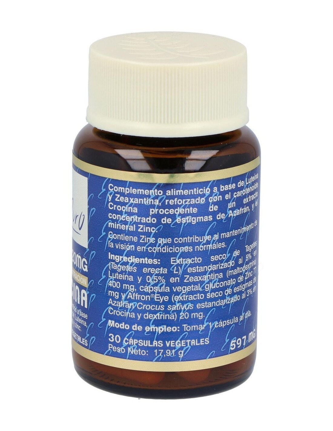 - Cada cápsula contiene 20 mg de luteína, un compuesto que contribuye a la protección de las células frente a agentes externos.