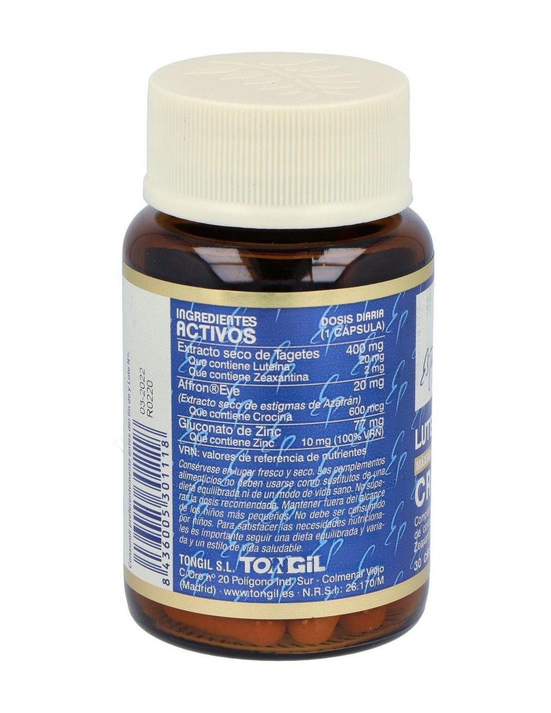 Luteina 20Mg. Crocina 30Cap. Estado Puro de Tongil es un suplemento diseñado para personas interesadas en mantener una dieta equilibrada que incluya nutrientes específicos para el cuidado visual y el bienestar general. Su formulación está pensada para quienes buscan complementar su alimentación diaria con ingredientes naturales.