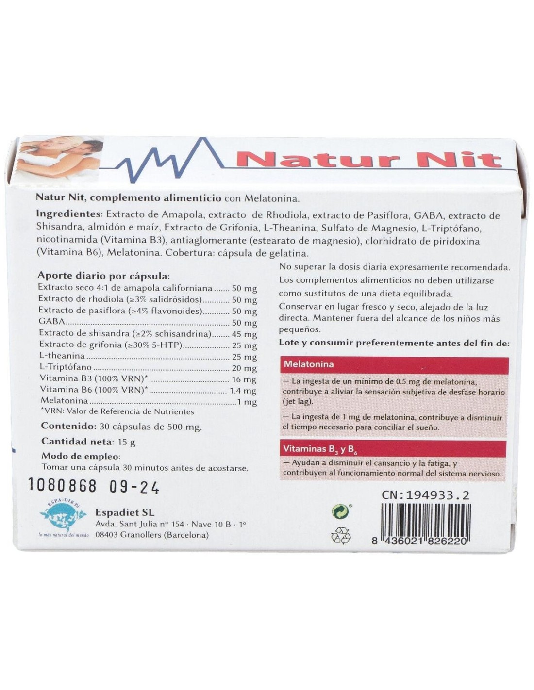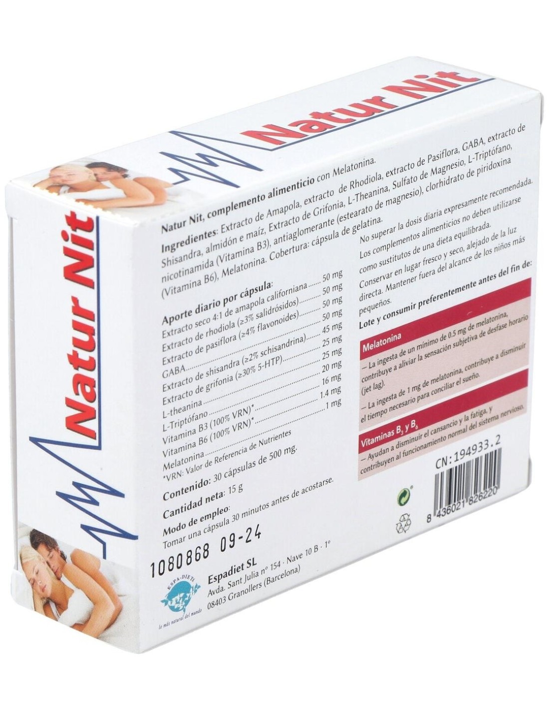 Natur Nit 30Cap. de Espadiet es un complemento diseñado para personas que buscan apoyar su bienestar diario mediante ingredientes seleccionados cuidadosamente. Es adecuado para quienes desean incorporar un producto con formulación natural dentro de su rutina habitual.