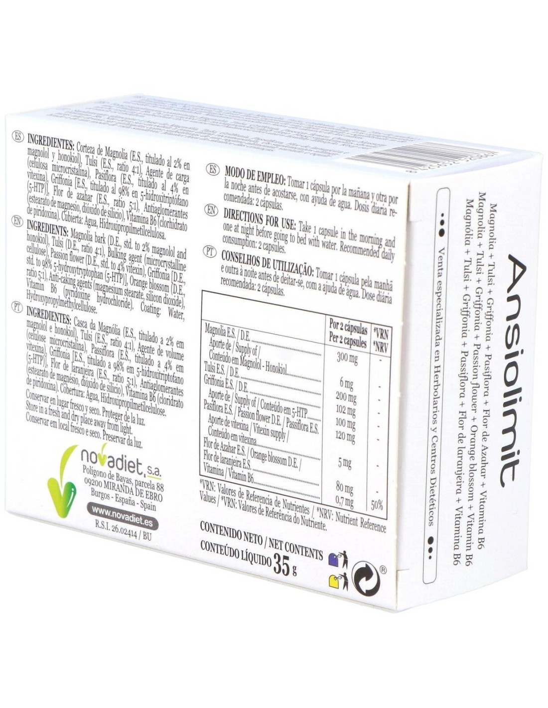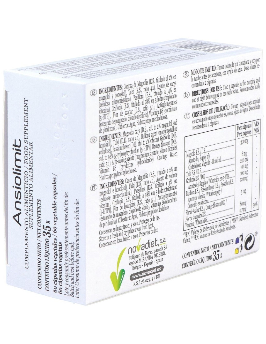 Ansiolimit Envase de 60 cápsulas vegetales de Novadiet está formulado para personas que buscan apoyar su bienestar emocional de manera natural. Este suplemento está diseñado para integrarse fácilmente en la rutina diaria, ofreciendo una opción basada en ingredientes de origen vegetal.