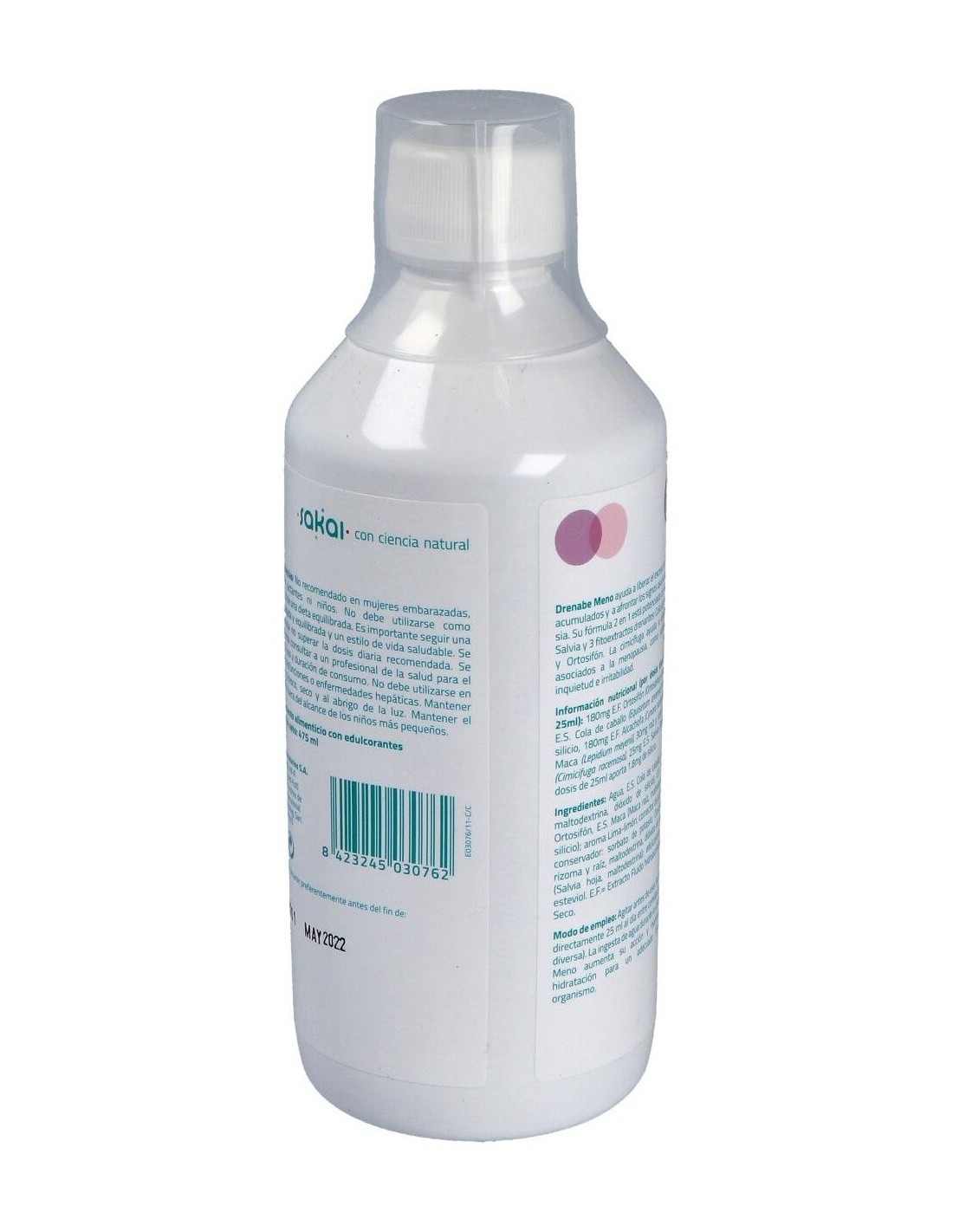 El Drenabe Femme 475Ml. de Sakai es un suplemento dirigido a mujeres que ayuda a apoyar el bienestar diario mediante una fórmula equilibrada diseñada para favorecer la hidratación y el equilibrio corporal.