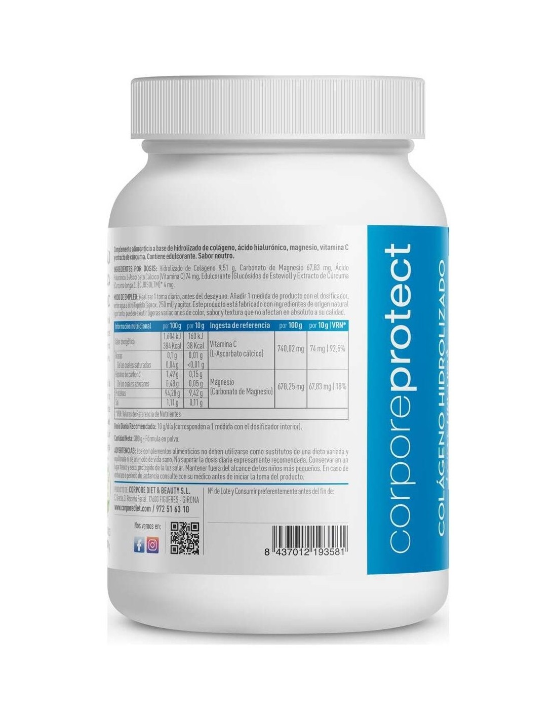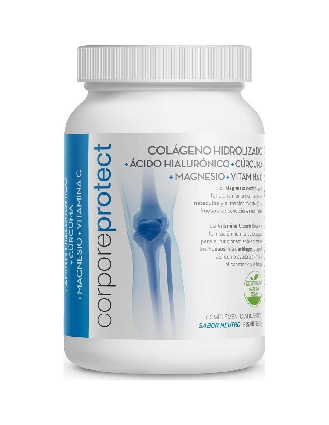 Corpore Protect Colágeno Hidrolizado 300g es un complemento que aporta Colágeno extra al organismo, para asegurar el correcto funcionamiento de huesos, tendones, articulaciones, cartílagos y ligamientos. La fórmula de Corpore Protect Colágeno Hidrolizado está hecha a base de Colágeno Hidrolizao, que fomenta la creación natural de Colágeno en el cuerpo y mejora el estado y aspecto de la piel. El resultado es una demis luminosa, firme e hidratada. Además, su fórmula incorpora Ácido Hialurónico, Cúrcuma, Magnesio y Vitamina C, para potenciar la absorción de Colágeno y aumentar sus propiedades regeneradoras.