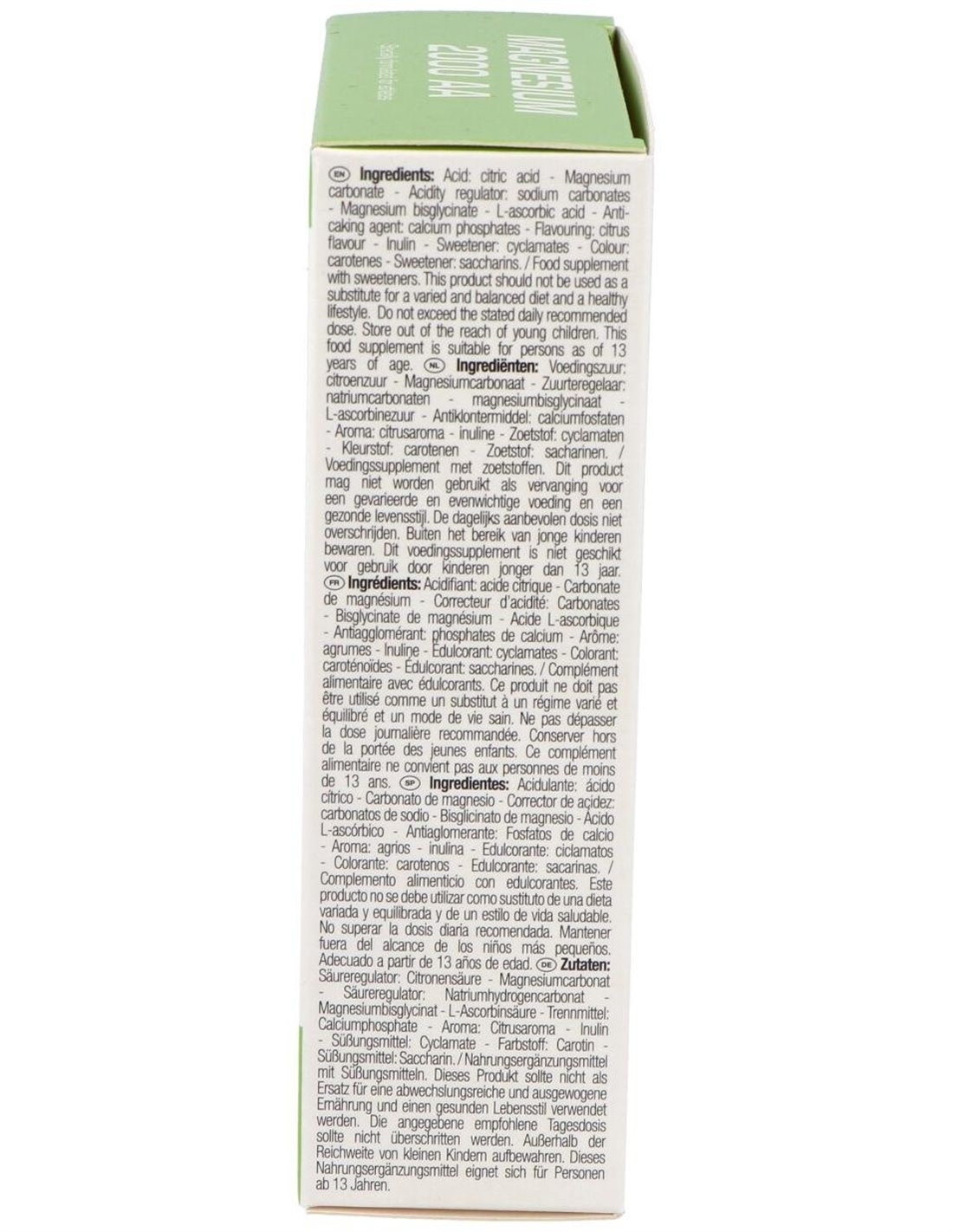 Acidulante: ácido cítrico - carbonato de magnesio - bisglicinato de magnesio bisglicinato - corrector de la acidez: carbonato sódico - ácido L-ascórbico (Vitamina C) - antiglomerante: fosfato de calcio - aroma de naranja - agente de carga: inulina - edulcorantes: ciclamato sódico, sacarina sódica - colorante: beta caroteno.
