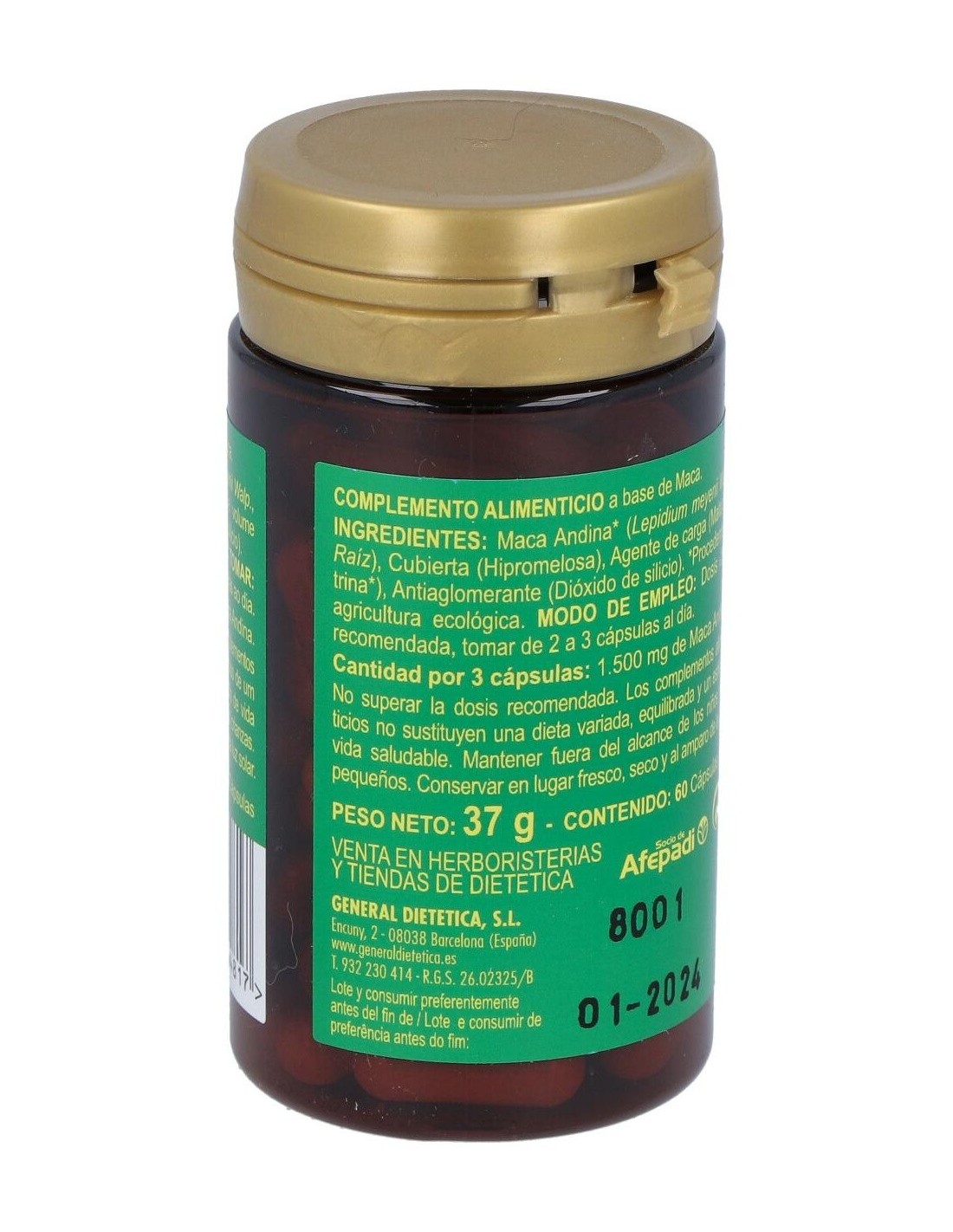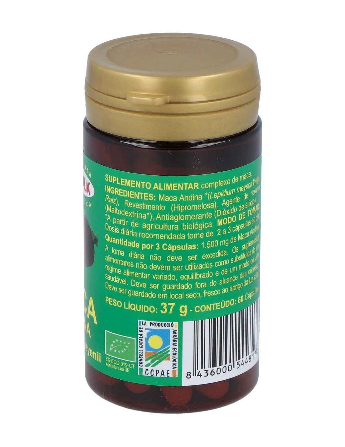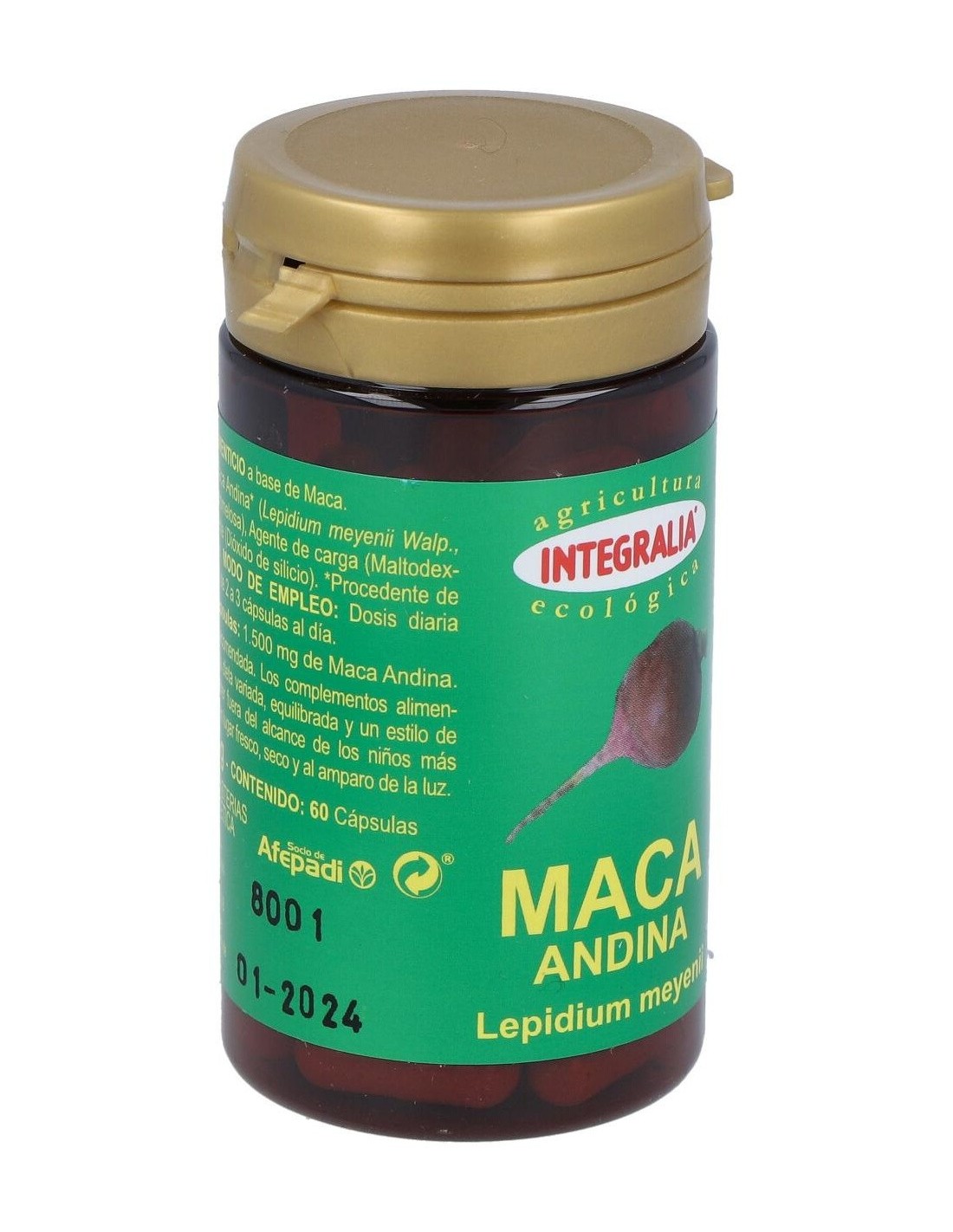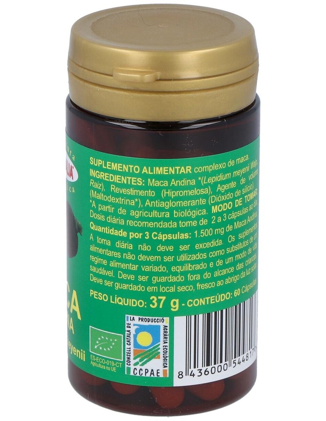 La Maca es rica en nutrientes que están relacionados con su actividad, como aminoácidos y glucosinolatos. Composición por dosis diaria:1.500 mg de maca andina. Modo de empleo:Tomar de 2 a 3 cápsulas al día. Presentación:Bote de 60 cápsulas.