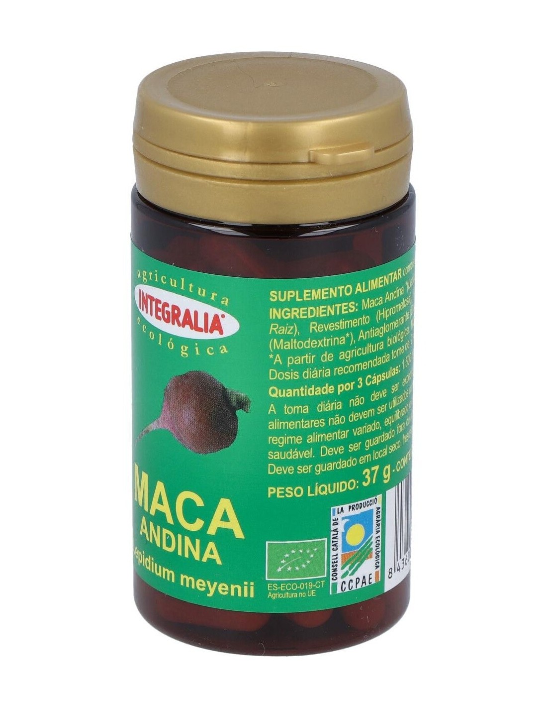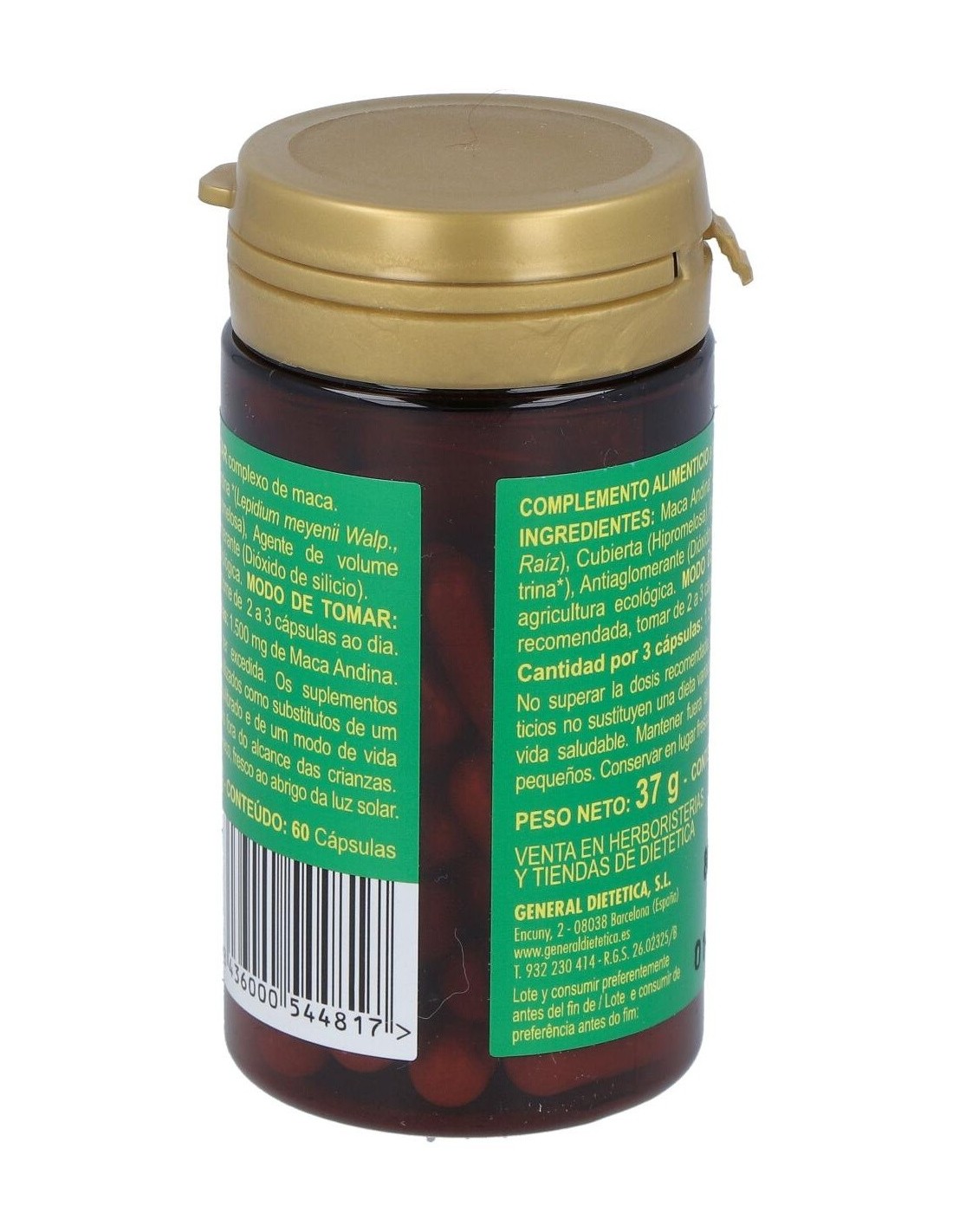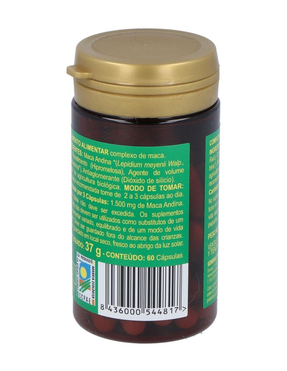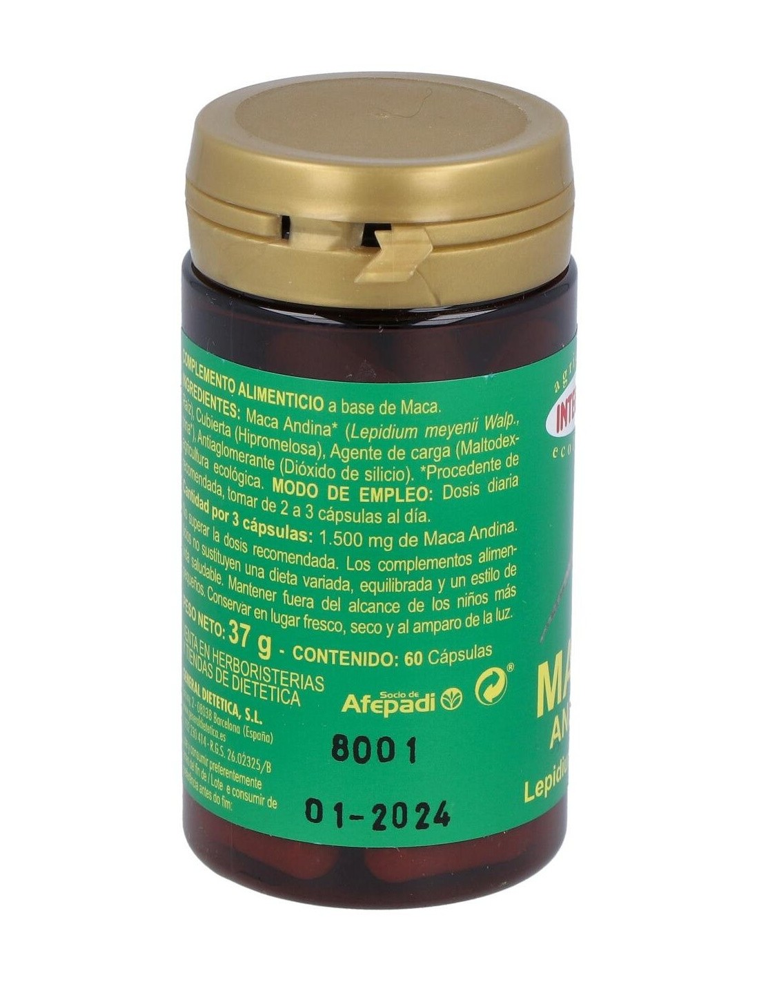 La Maca es rica en nutrientes que están relacionados con su actividad, como aminoácidos y glucosinolatos. Composición por dosis diaria:1.500 mg de maca andina. Modo de empleo:Tomar de 2 a 3 cápsulas al día. Presentación:Bote de 60 cápsulas.