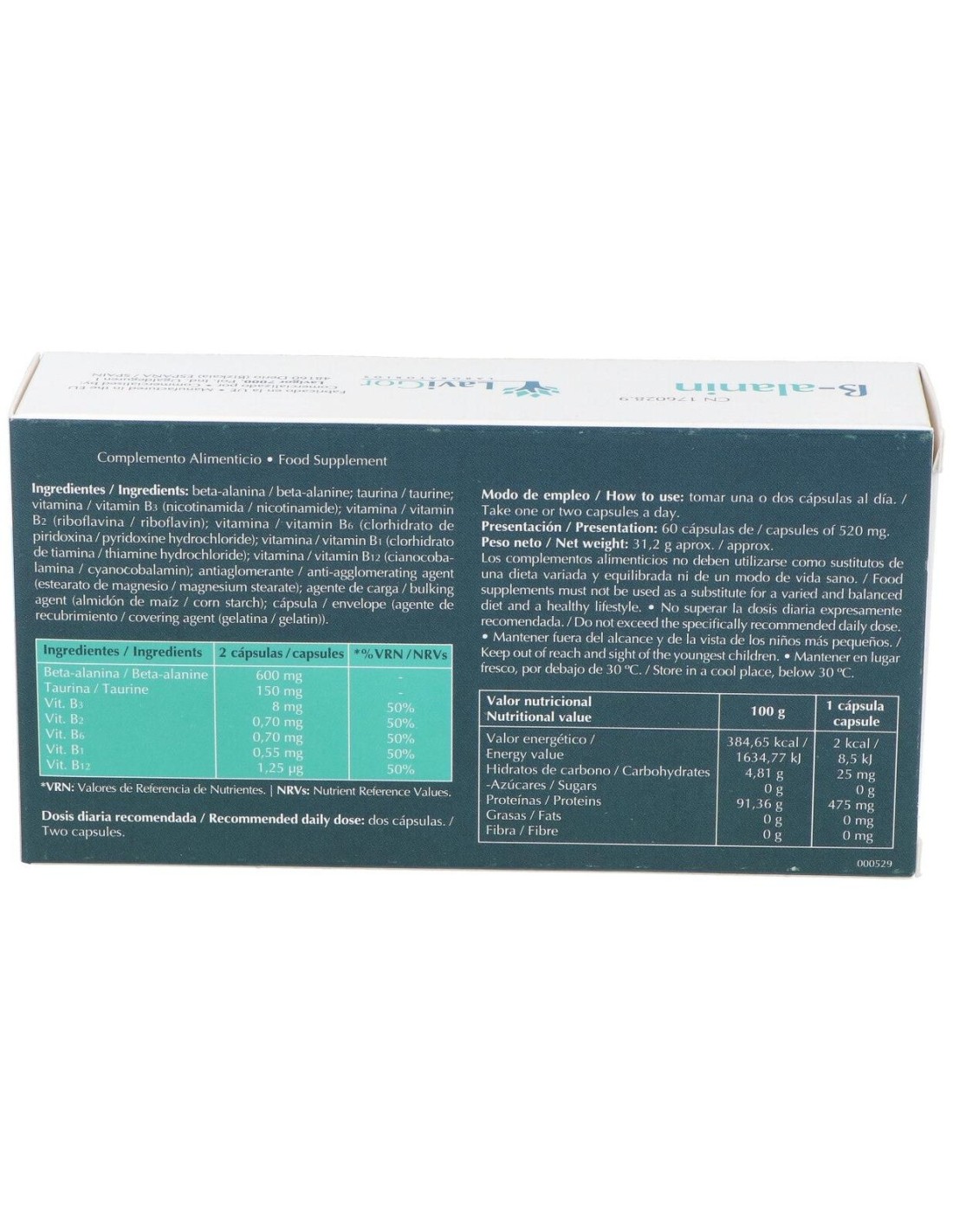 Suplemento a base de beta-alanina para compensar los estados carenciales, reforzado con taurina, que favorece la resistencia a la fatiga, y vitaminas del grupo B, que ayudan en el mantenimiento del sistema nervioso.