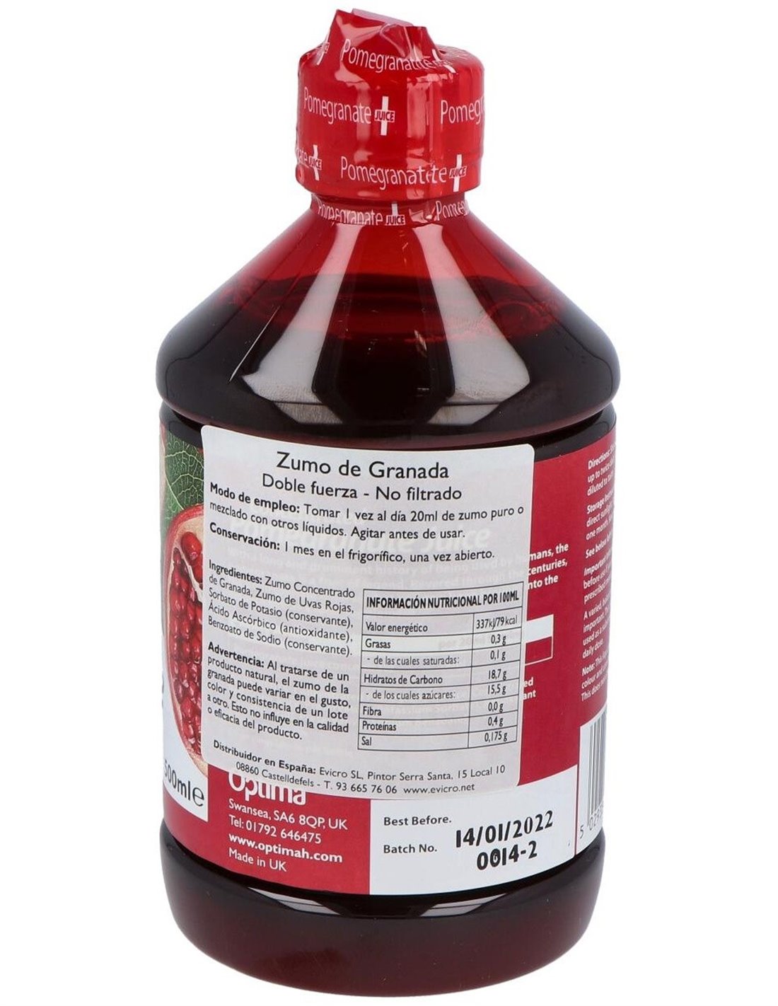 Ingredientes:Zumo Concentrado de Granada, Zumo de Uvas Rojas, Sorbato de Potasio (conservante), Ácido Ascórbico (antioxidante), Benzoato de Sodio (conservante).Valor nutricional por 100 ml: