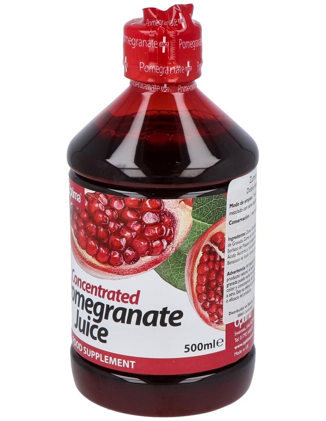 Ingredientes:Zumo Concentrado de Granada, Zumo de Uvas Rojas, Sorbato de Potasio (conservante), Ácido Ascórbico (antioxidante), Benzoato de Sodio (con