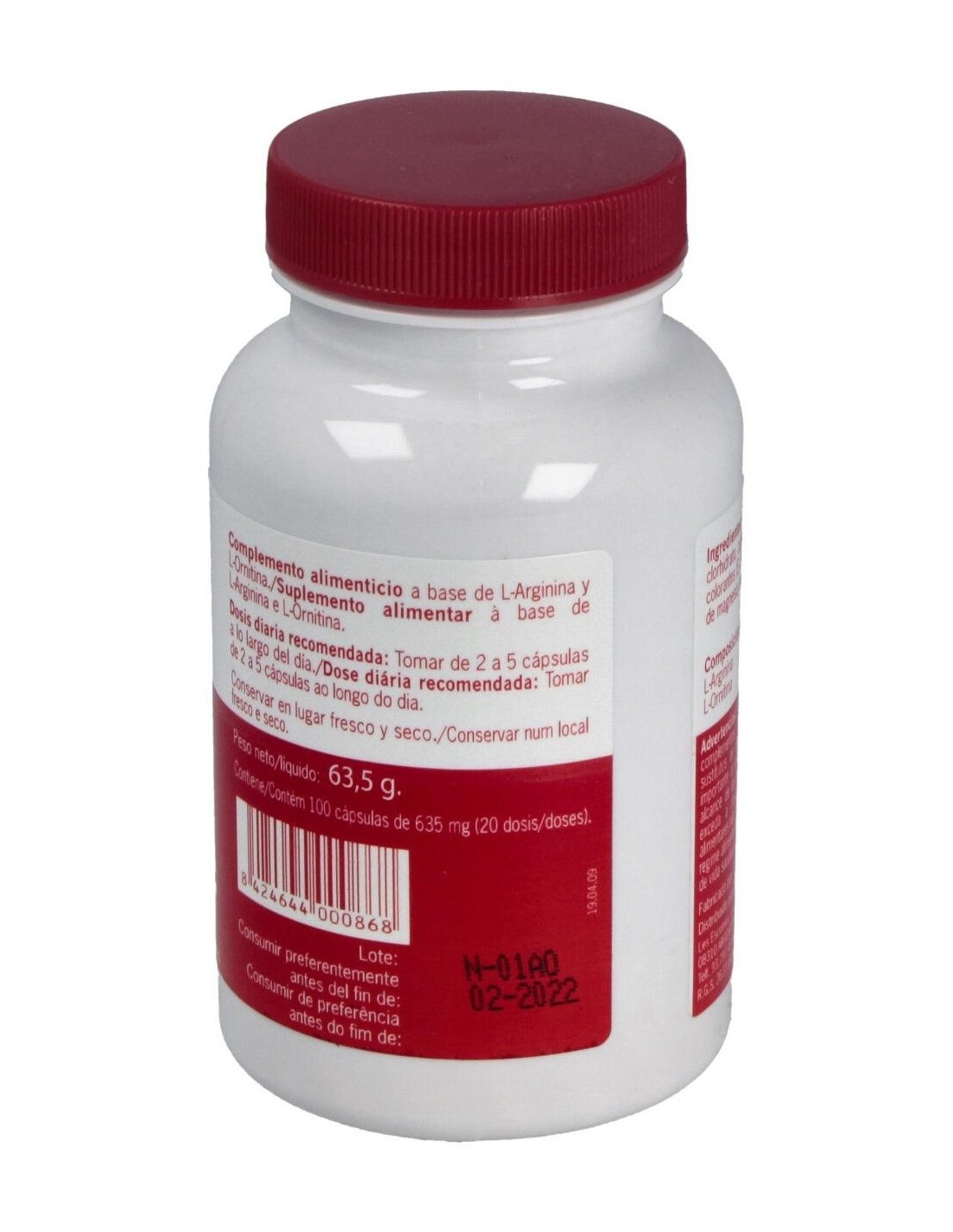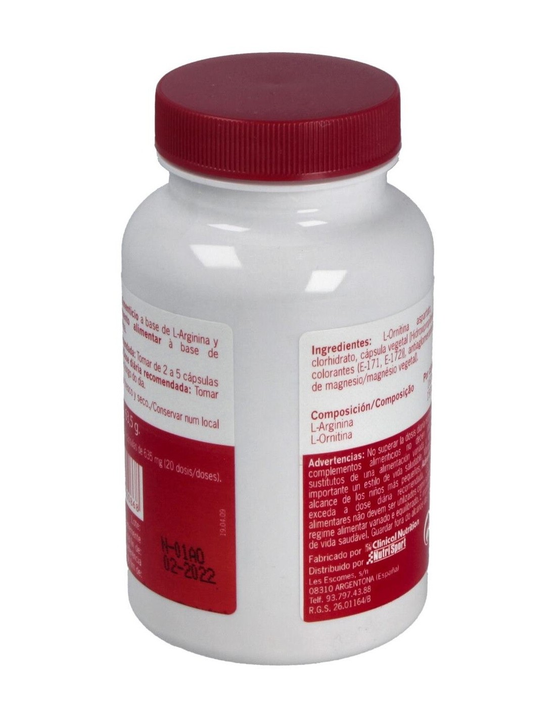 L-Arginina, L-Ornitina, Cápsula de gelatina [gelatina, colorante (E-171, E-110, E-104)], antiaglomerante (Estearato de Magnesio).