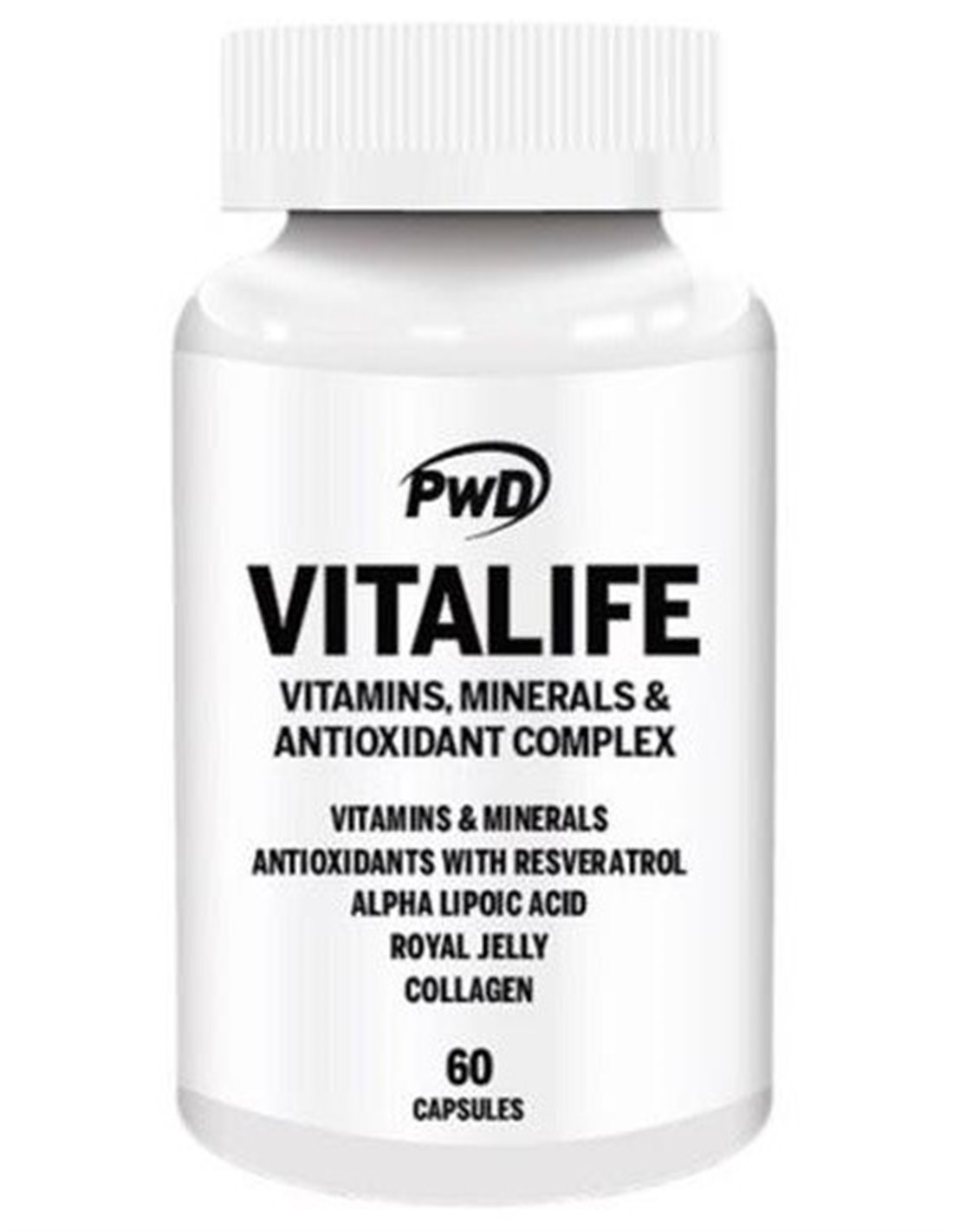 Complemento alimenticio que contribuye a mejorar el rendimiento físico y mental. Ayuda a reducir la sensación de cansancio y/o fatiga, mientras favorece la protección celular antioxidante. Formulado a base de resveratrol, coenzima Q10, vitaminas A, C, D3, E, B2, B3, B6, B5 y ácido fólico. Además, contiene calcio, hierro, magnesio, zinc, selenio, cobre, manganeso, yodo, fósforo, extracto de borraja, equinácea, colágeno, escaramujo, jalea real, ácido hialurónico, olivo, jengibre alga Kelp.