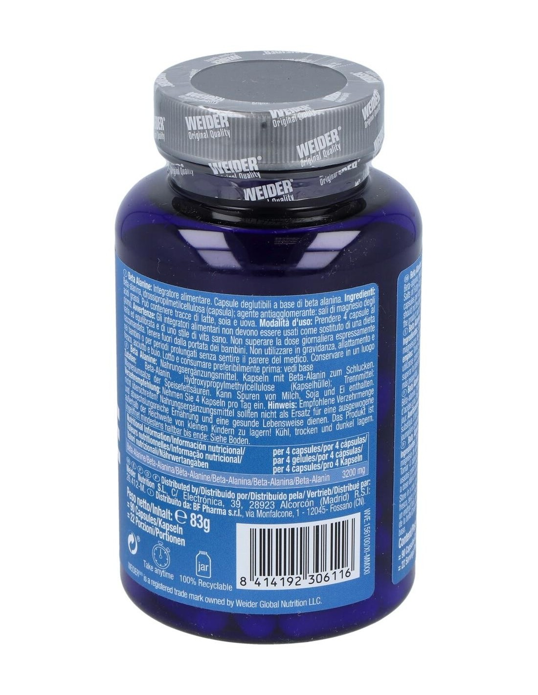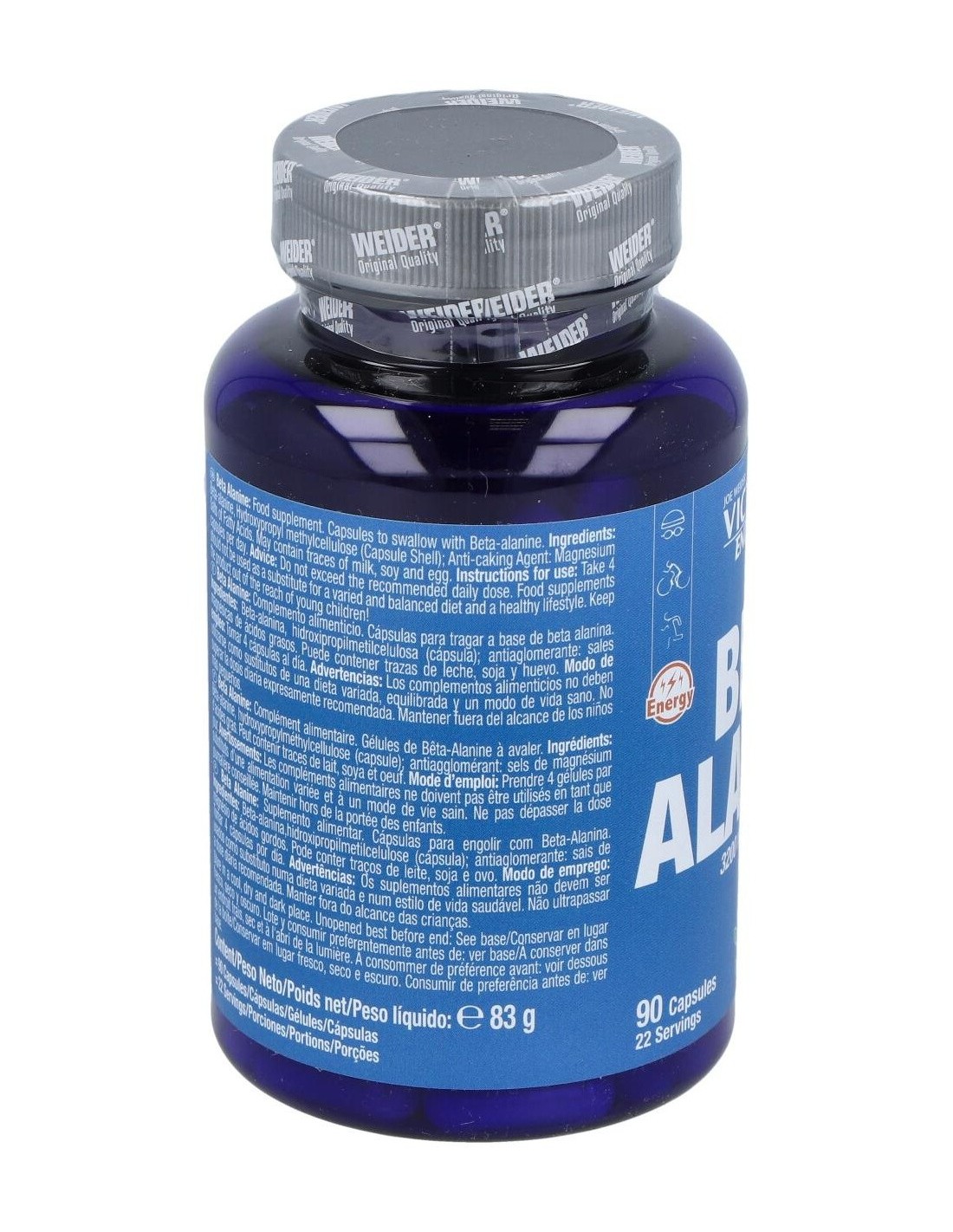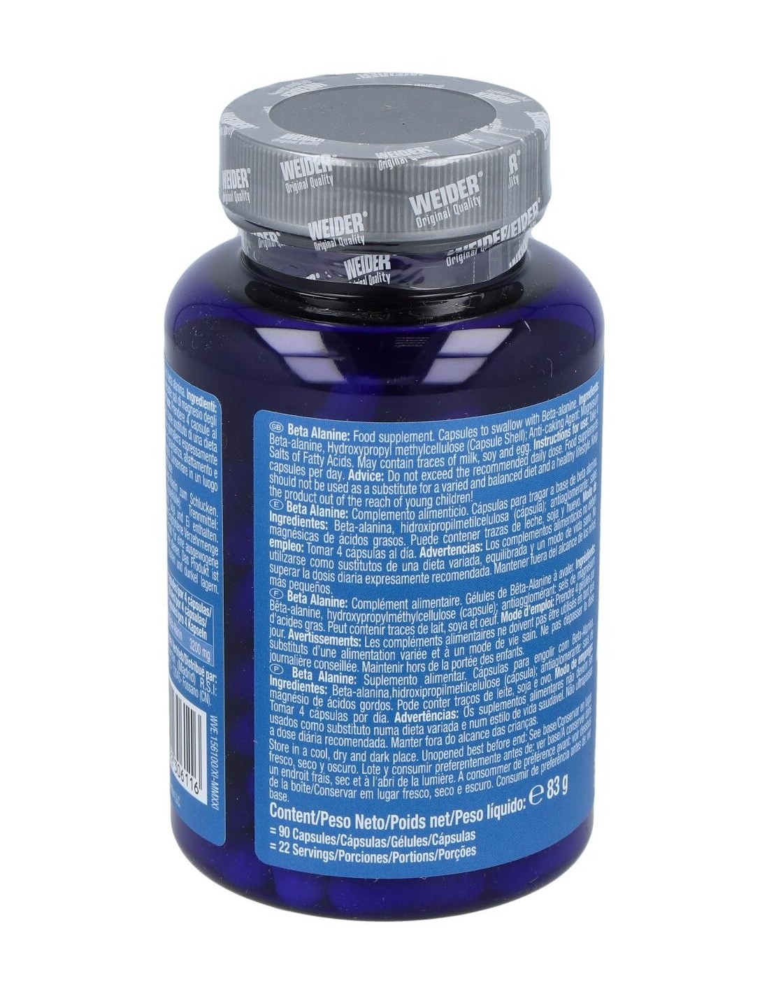 Complemento alimenticio compuesto por Beta-alanina, aminoácido no esencial, único por la especial posición que ocupa el grupo amino, efectivo como suplemento ergogénico, aumentando así la potencia muscular y con marcado efecto antoxidante. La beta-alanina es un aminoácido implicado directamente con el aumento de la carnosina, dipéptido que se encuentra en la musculatura y cerebro, cuya liberación en el organismo se traduce en un aumento de la resistencia, una mejora en la contracción muscular y un retraso de la fatiga. Previene la hiper acidez muscular, inhibiendo la producción de ácido láctico, aumentando así la capacidad de rendimiento. Buen regulador del calcio, induce una rápida liberación del calcio, mejorando la contracción muscular, y aumentando el tiempo de entrenamiento. Reduce el estrés oxidativo, consiguiendo que el rendimiento sea mayor y acelerando la recuperación muscular.