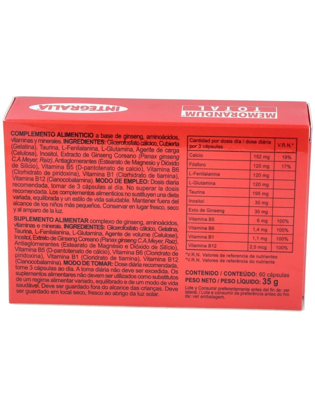 Memorandum Total 60Cap. de Integralia es un suplemento nutricional dirigido a adultos que buscan apoyar su función cognitiva diaria, formulado con ingredientes seleccionados para contribuir al bienestar mental.
