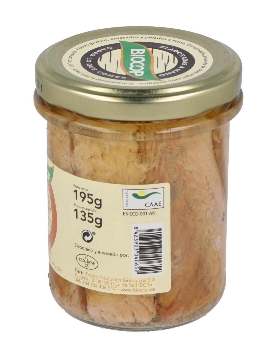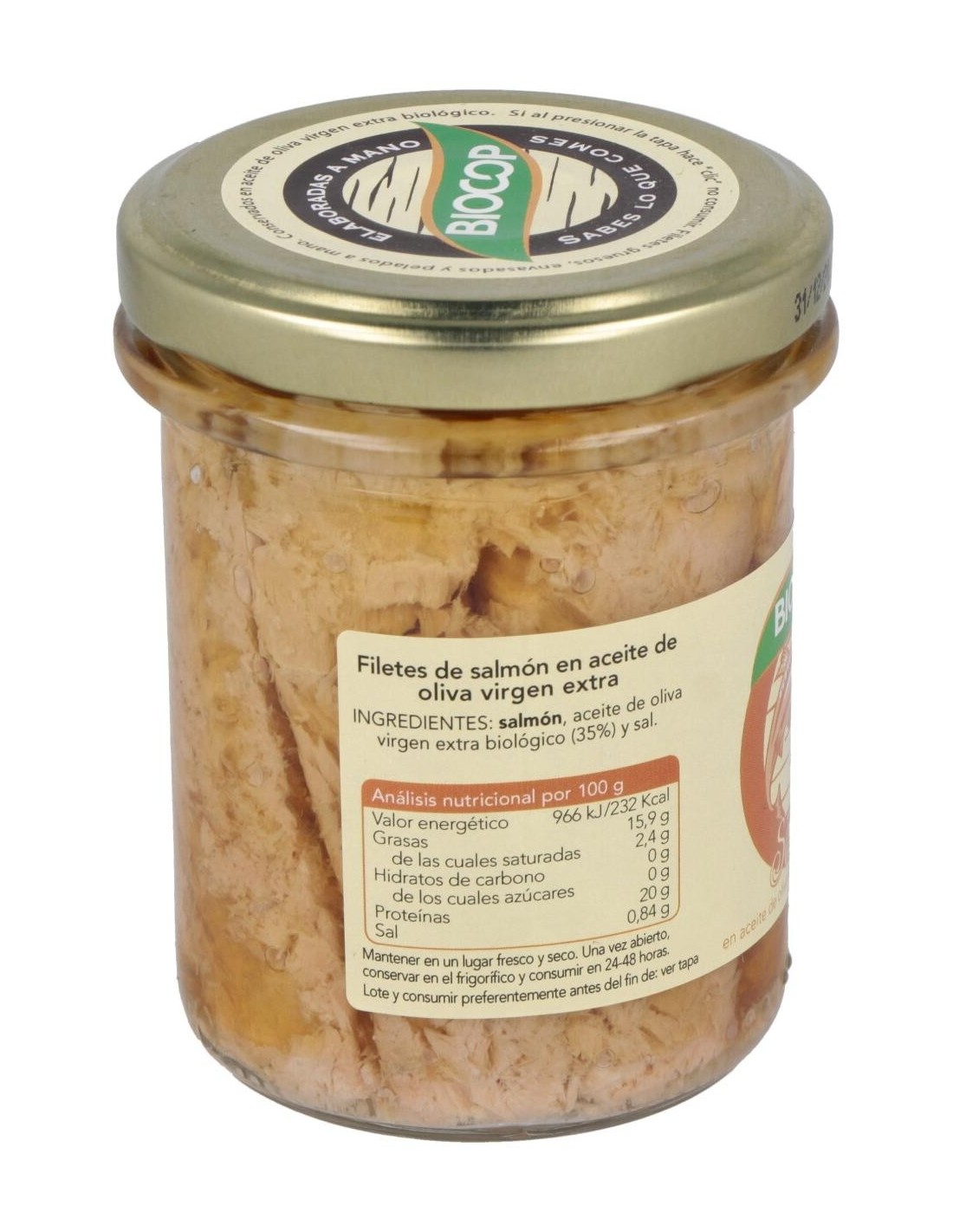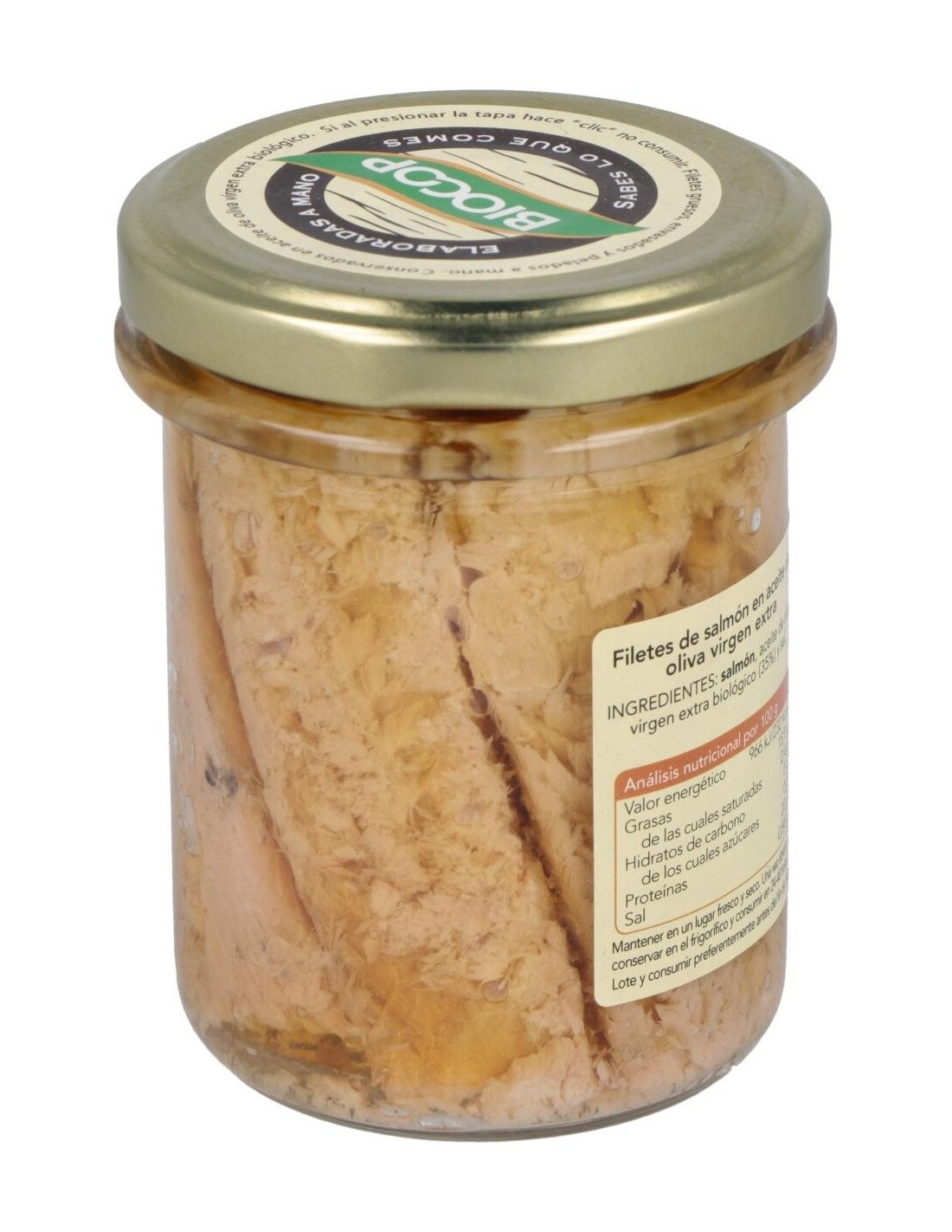 Ingredientes:Salmón, aceite de oliva virgen extra*, sal marina. (*) De cultivo ecológico.Valor nutricional por 100 gramos: