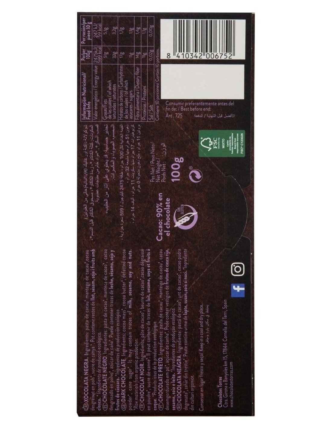 Chocolate Negro 90% Criollo Forastero 100G Bio Sg de Torras