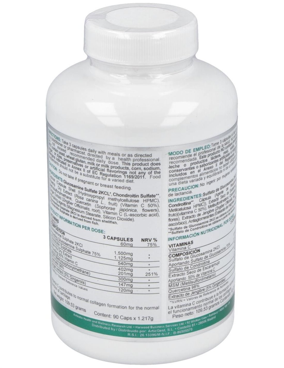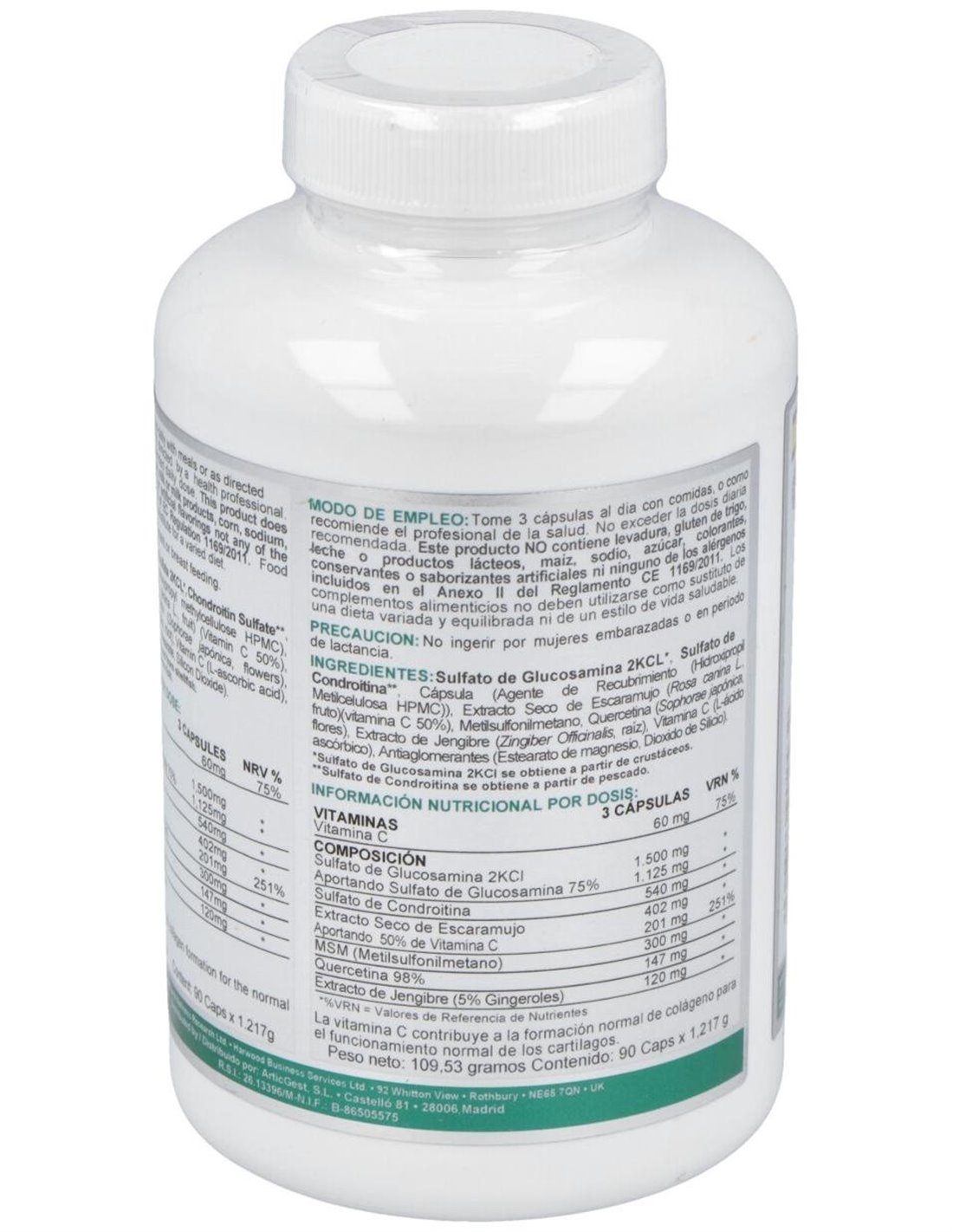 2.000 mg de sulfato de glucosamina 2KCI (1.500 mg de sulfato de glucosamina y 540 mg de sulfato de condroitina).
