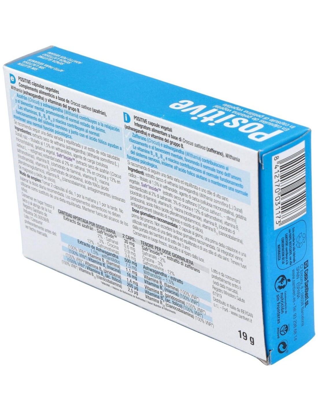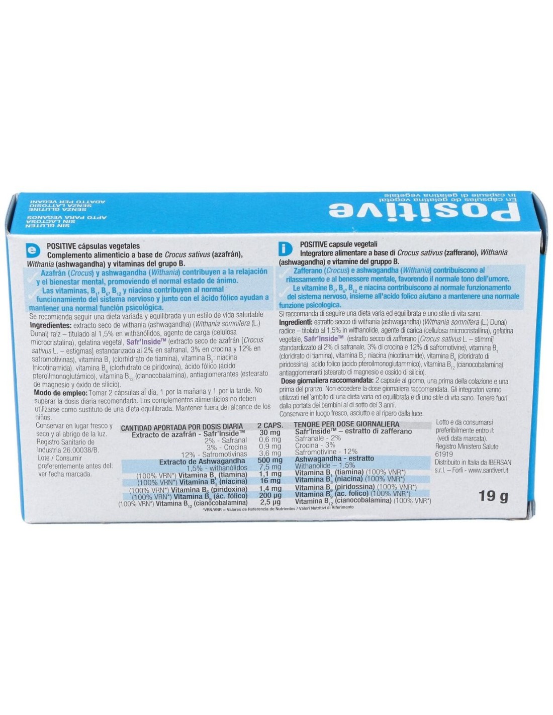 30 mg de Extracto de azafrán (2 % safranal - 0,6 mg) (3% Crocina - 0,9 mg) (12% Safromotivinas - 3,6 mg), 500 mg Extracto de Ashwagandha) (1,5% witanólidos - 7,5 mg), (100% VRN) vitamina B1 (tiamina) 1,1 mg, (100% VRN) vitamina B3 (niacina) 16 mg, (100% VRN) vitamina B6 (piridoxina) 1,4 mg, (100% VRN) vitamina B9 (ác. fólico) 200 µg, (100% VRN) vitamina B12 (cianocobalamina) 2,5 µg.