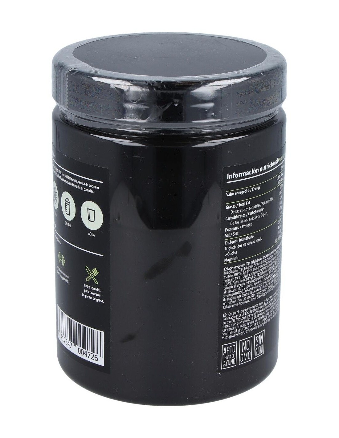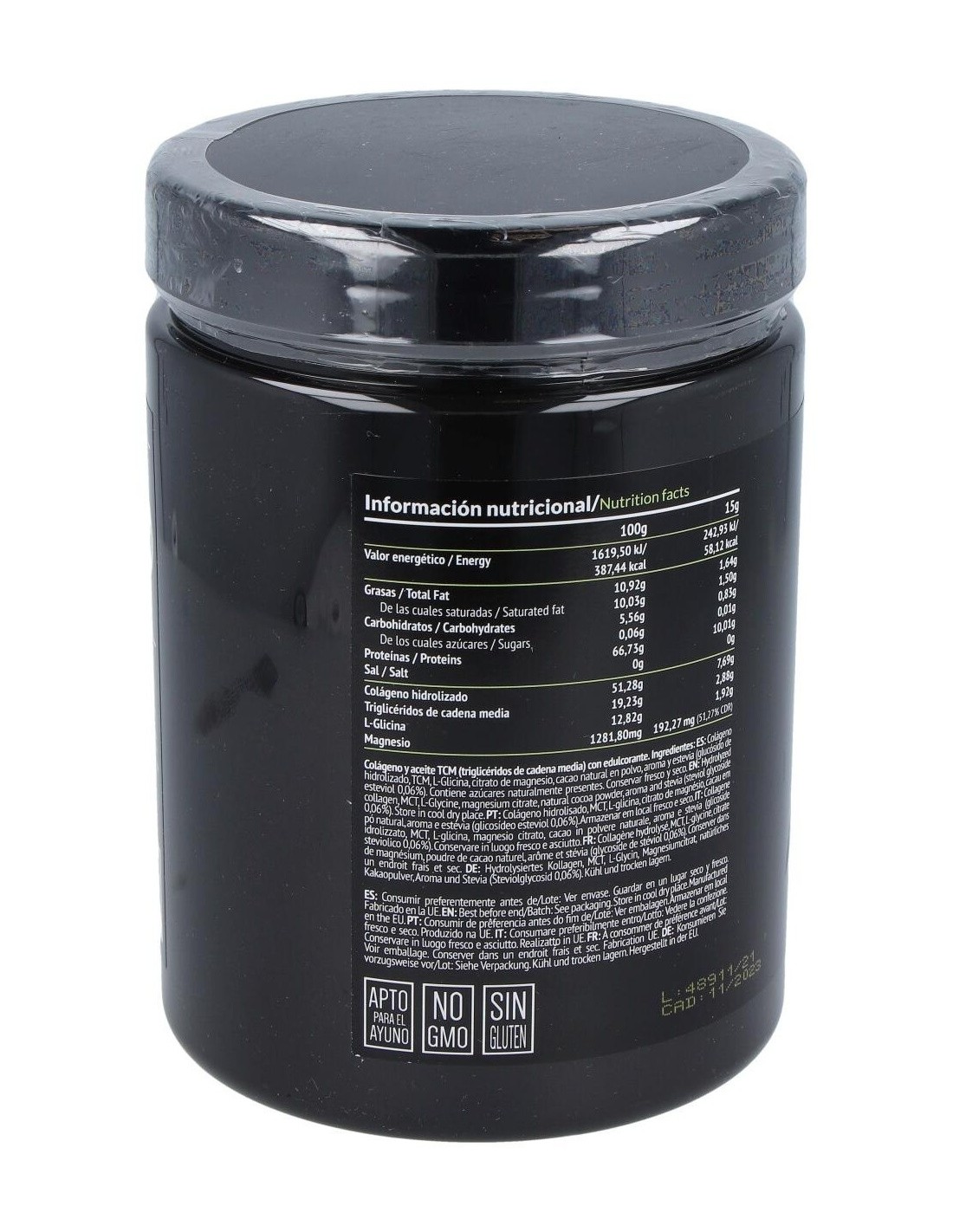 Ingredientes:Colágeno hidrolizado en polvo, TCM, glicina, citrato de magnesio, cacao natural en polvo, aroma y estevia (glucósido de esteviol 0,06%).Modo de empleo:Tomar 1 cacito (aproximadamente 15 grs) diluido en 200-250 ml de agua, zumo o tu bebida favorita. También puedes tomarlo como comidas.Presentación:Envase de 450 gramos.Recomendaciones y advertencias:No contiene gluten ni azúcares añadidos. Compatible con dietas KETO. Apto para el ayuno. Contiene leche.