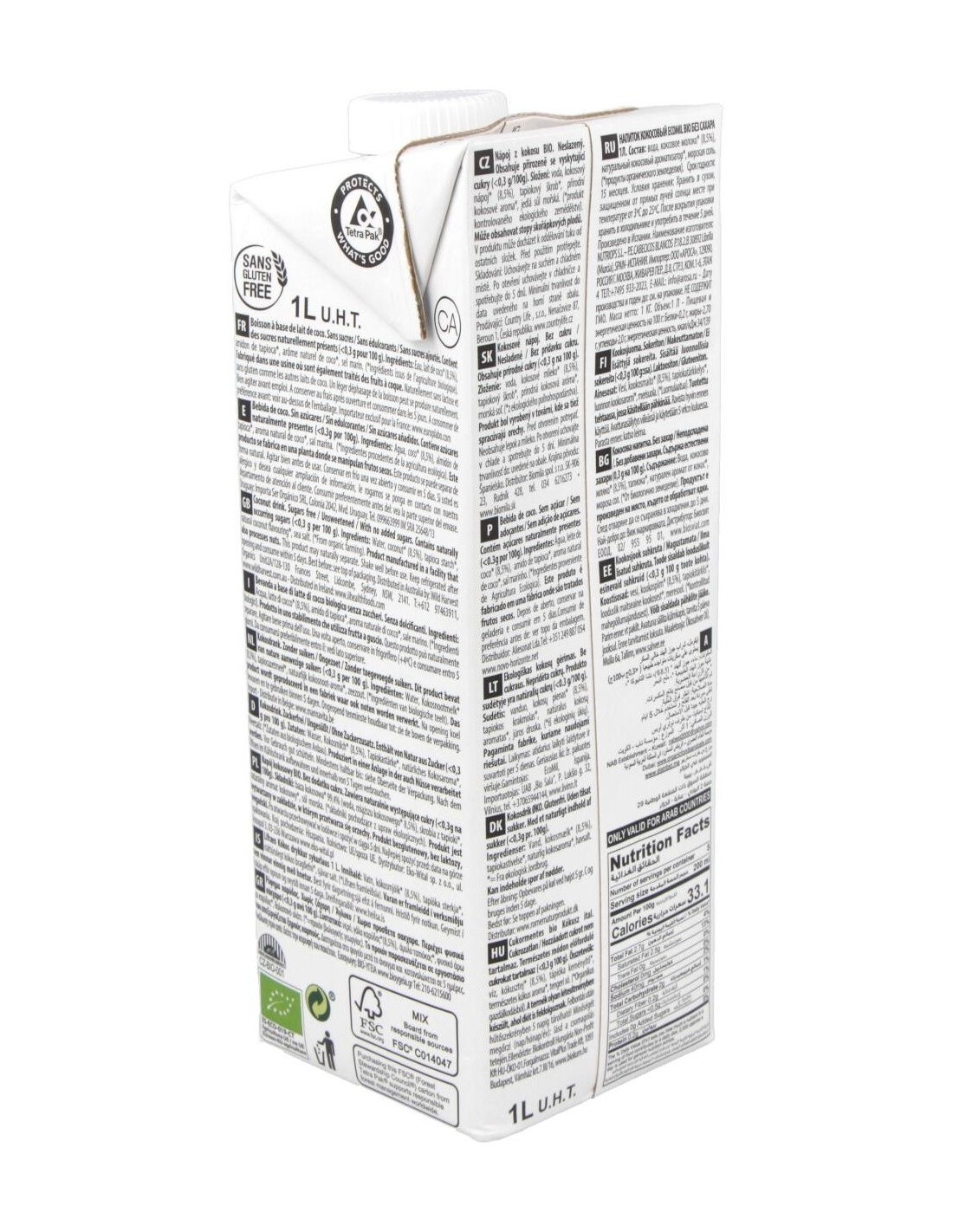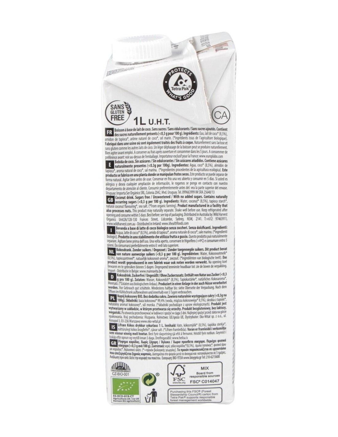 Agua, coco* (8.5%), almidón de tapioca*, aroma natural de coco*, sal marina.