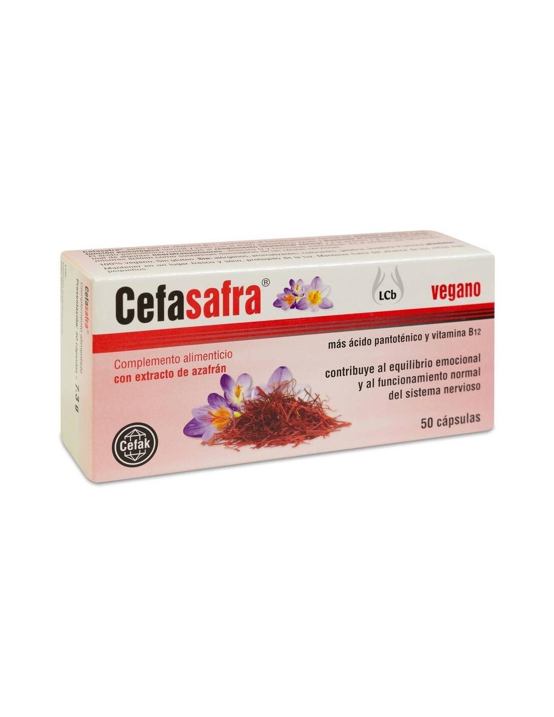 Cefasafra es un complemento alimenticio que contribuye al equilibrio emocional y al funcionamiento normal del sistema nervioso. Es un producto de alta calidad con extracto de azafrán y vitaminas B en altas dosis. Para mantener un estado de ánimo positivo y su equilibrio emocional recuerde la importancia de: realizar actividad física, la relajación, una buena alimentación, beber suficiente agua, la vida social y sobre todo, tratar de evitar el estrés! ¡Cuídese! ¡Le deseamos una buena salud!El extracto de azafrán utilizado en el Cefasafra® es de alta calidad (calidad Sargol), contiene sólo las puntas rojas de los estigmas que garantizan la máxima concentración de principios activos. El azafrán se ha empleado tradicionalmente para contribuir al equilibrio emocional, a la relajación y a un estado de ánimo positivo.La vitamina B12 (metilcobalamina) contribuye a la función psicológica normal y al funcionamiento normal del sistema nervioso. El ácido pantoténico pertenece al grupo de vitaminas B (vitamina B5) y contribuye al rendimiento intelectual normal. Ambos, ayudan a disminuir el cansancio y la fatiga y contribuyen al metabolismo energético normal. Además, el ácido pantoténico contribuye a la síntesis y al metabolismo normal de las hormonas esteroideas, la vitamina D y algunos neurotransmisores.Composición activa por 2 cápsulas: