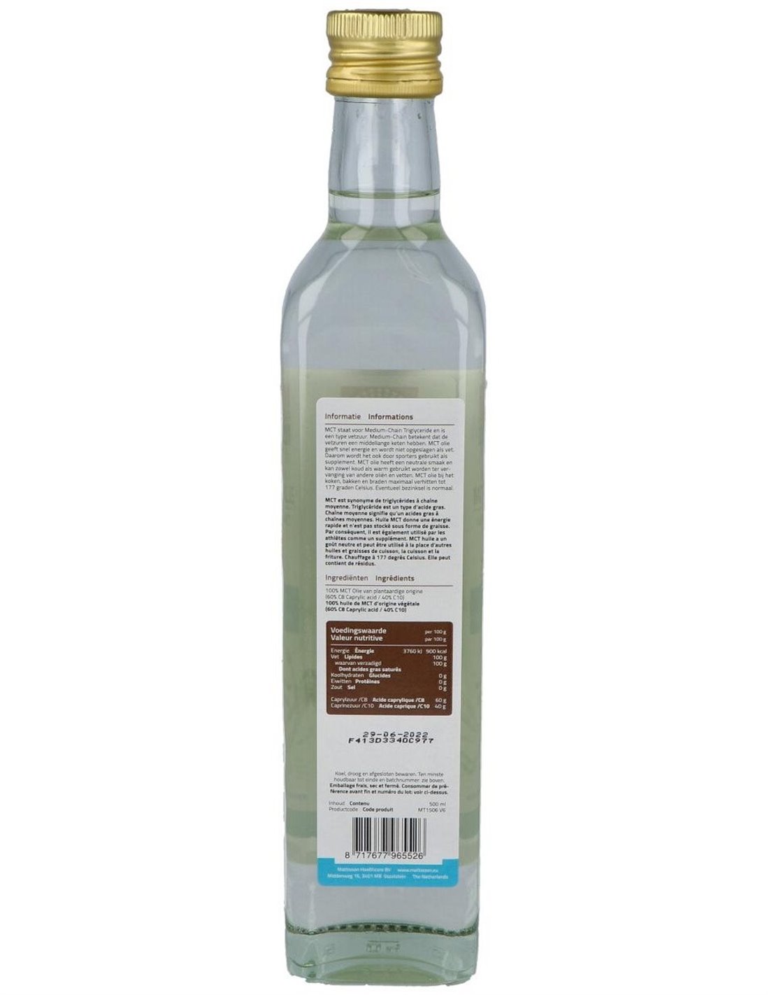 Aceite compuesto por triglicéridos de cadena media (MCT, medium chain triglycerides) que proporcionan un 60% de ácido caprílico (C8) y un 40% de ácido cáprico (C10). Estos ácidos grasos de 8 y 10 carbonos, se digieren, se absorben y se metabolizan de forma diferente que los ácidos grasos de cadena larga. Al ser más hidrosolubles, no se incorporan a los quilomicrones y no participan directamente en la lipogénesis. Ideal como complemento a las dietas cetogénicas (dietas KETO) o como fuente de energía en deportistas. Apto para veganos.