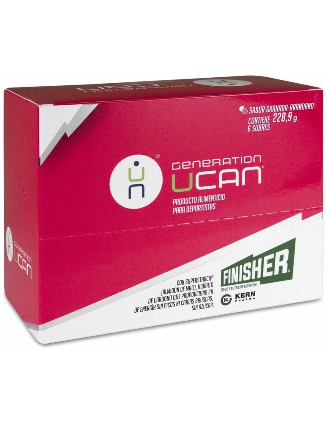 Finisher Generation Ucan Granada y Arándano 6 Sobres es un complemento alimenticio en sobres con hidratos de carbono que ayudan a proporcionar 2 horas de energía. También contiene proteínas por este motivo, colabora a aumentar y conservar la masa muscular. Con sabor a granada y arándanos.