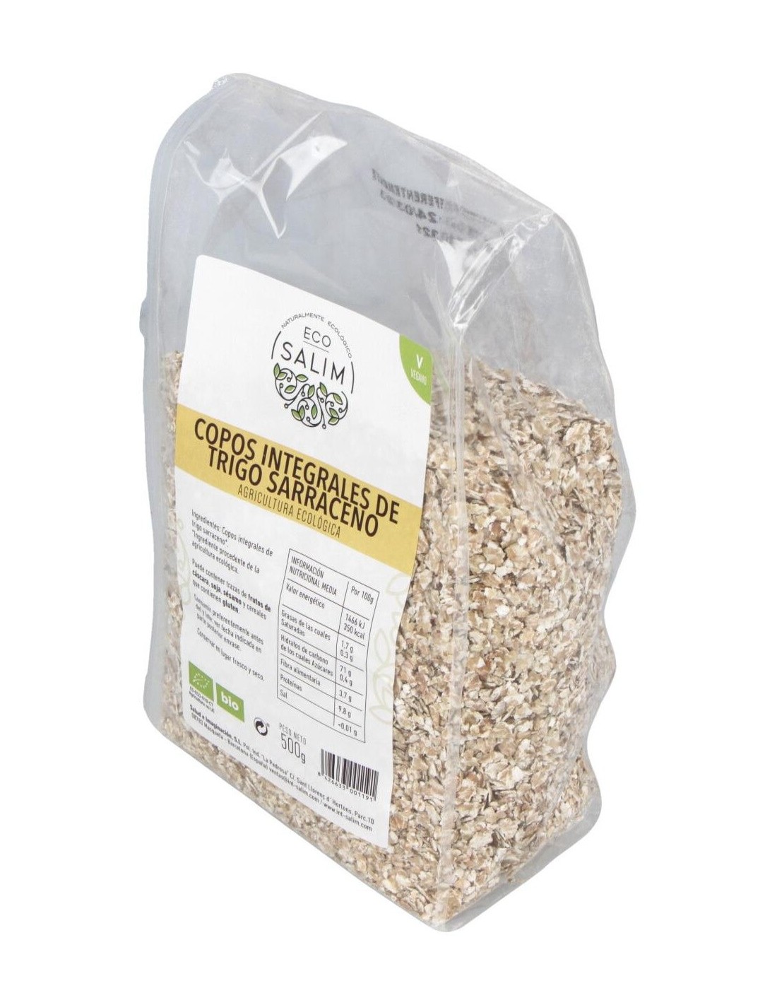 Copos integrales de trigo sarraceno de Int-Salim (empresa de alimentación saludable). Este producto sirve para elaborar diversas recetas de comida según la preferencia del usuario: galletas, tartas, crepes, etc. Múltiples beneficios se le atribuyen al trigo sarraceno. Por ejemplo, se trata de un alimento rico en proteínas. Tiene a su favor vitaminas (como la E, B1, B2, etc.) y minerales (potasio, fósforo, calcio, etc.). Algo también particular del trigo sarraceno es que se trata de un alimento rico en fibra, lo cual ayuda a personas que se encuentren en pérdida de peso por su efecto saciante. Es apto para personas veganas. Puede contener trazas de frutos de cáscara, soja y sésamo, así como de cereales que contengan gluten; de tal modo, tener precaución por las personas alérgicas a estos componentes.