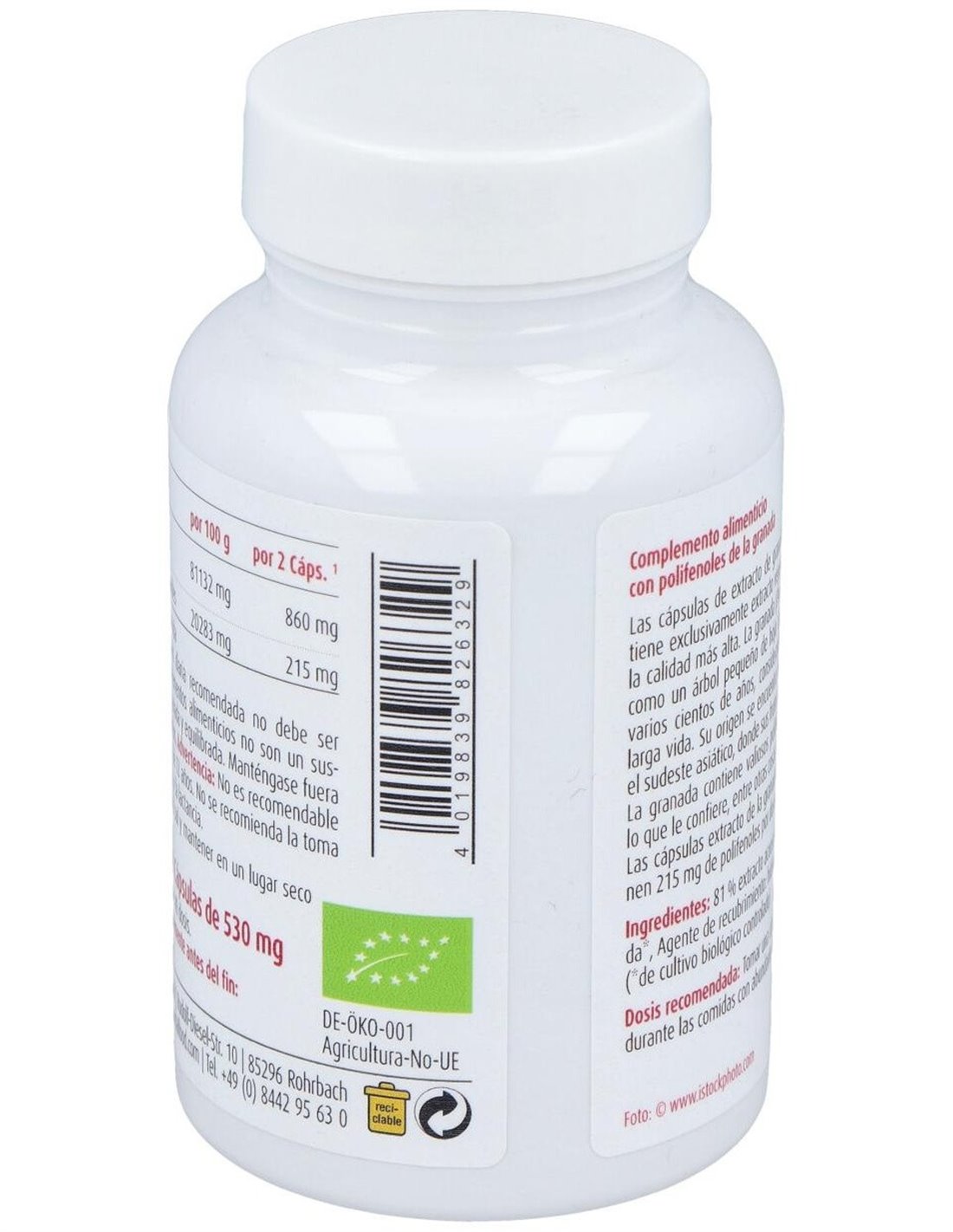 - Cada cápsula contiene 530 mg de extracto de granada bio, aportando una fuente natural de compuestos presentes en esta fruta.