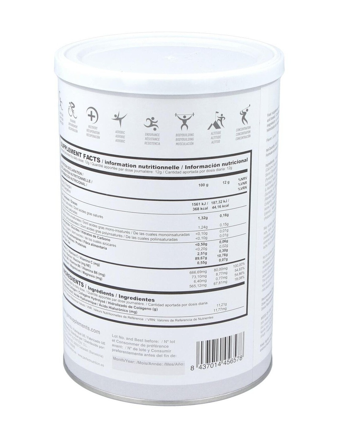 Hidrolizado de Colágeno, Carbonato Magnésico, Acidulante (Ácido Cítrico), Vitamina C (L-Ascorbato Cálcico), Aroma Natural de Limón con Otros Aromas Naturales, Edulcorantes (Sucralosa y Glucósidos de Esteviol), Ácido Hialurónico, Vitamina B3 (Nicotinamida), Colorante (Riboflavina) y Vitamina B6 (Piridoxina Clorhidrato).