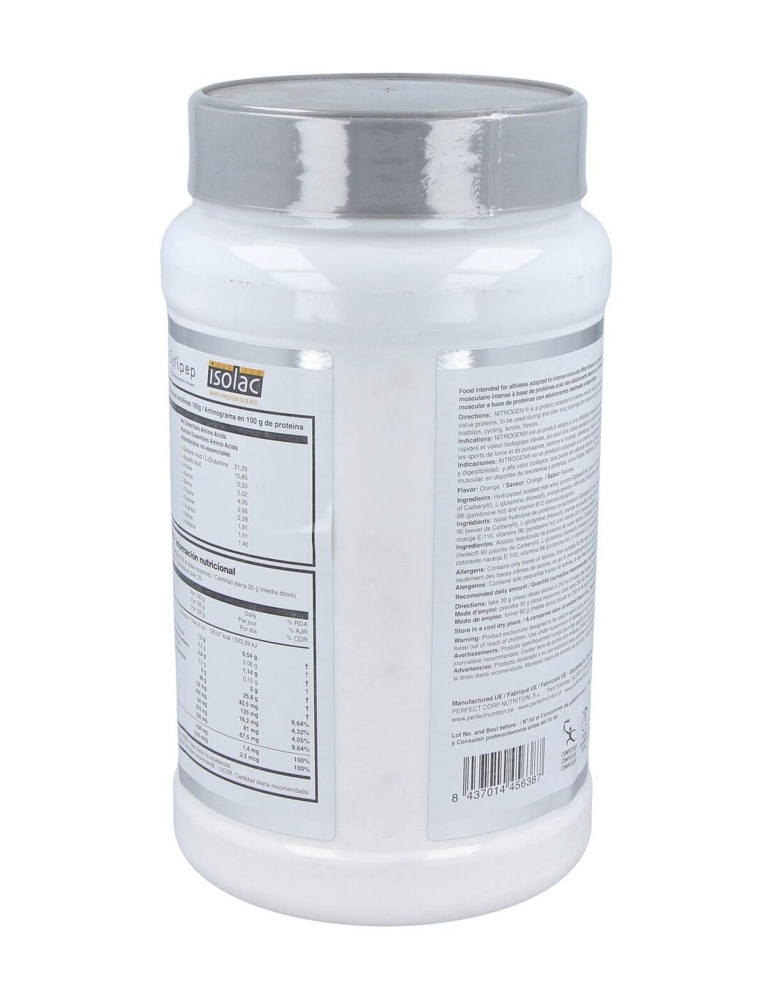 Ácido hidrolizado de proteína de suero lacteo (Optipep 90 patente de Carbery) 45%, aislado de proteína de suero lacteo (isolac 90 patente de Carbery) 45%, L-glutamina (kiowa) 5,5%, naranja en polvo, ácido cítrico, aromas, edulcorante E-955 (sucralosa), colorante naranja E-102, vitamina B6 (piridoxina hcl), vitamina B12 (cianocobalamina)