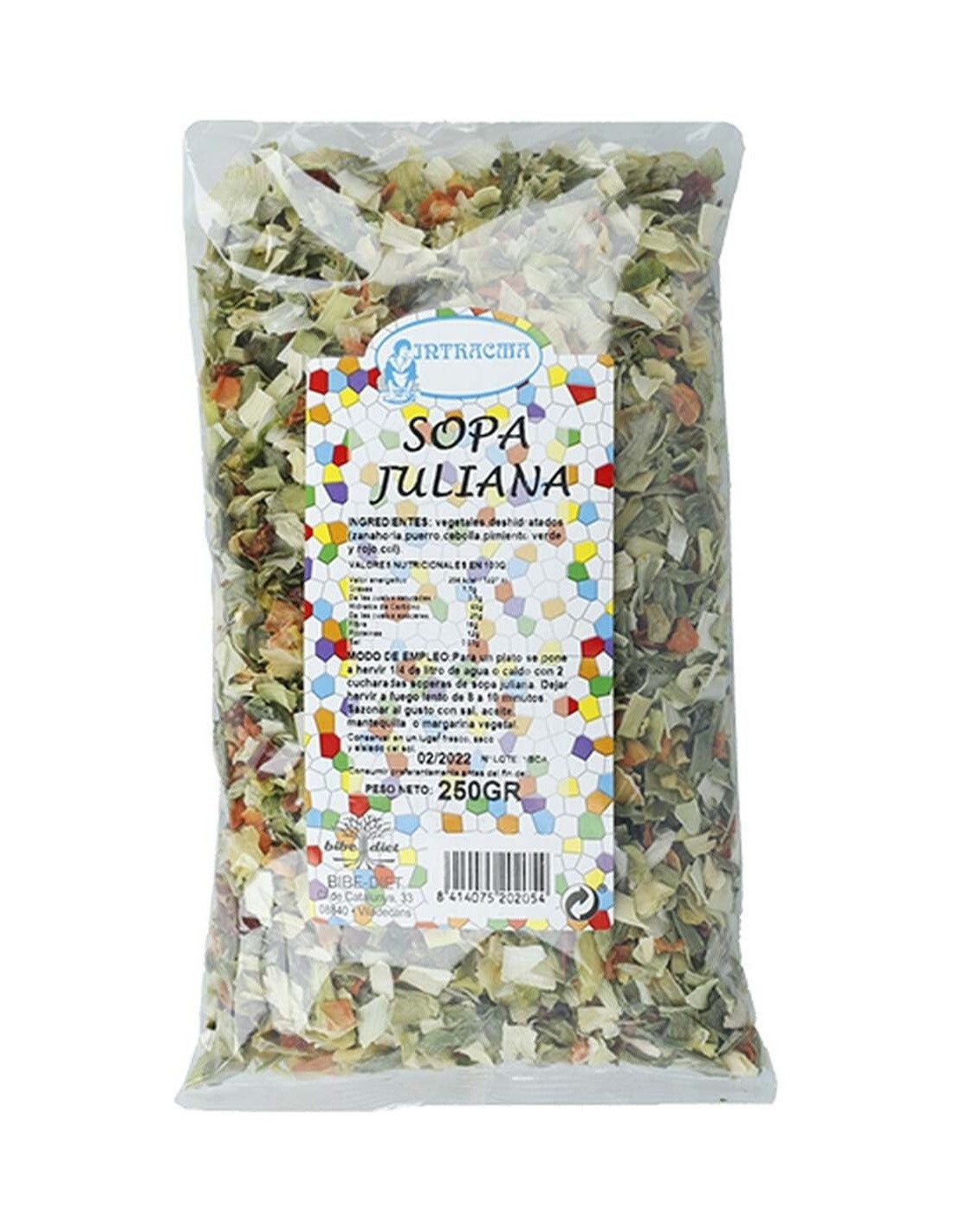 Conjunto de verduras deshidratadas en juliana para elaborar sopas. Con ingredientes orgánicos, procedentes de agricultura ecológica. Para consumir agregar agua hirviendo a gusto. Puede contener trazas de frutos secos, soja, sésamo y cereales que contiene gluten.