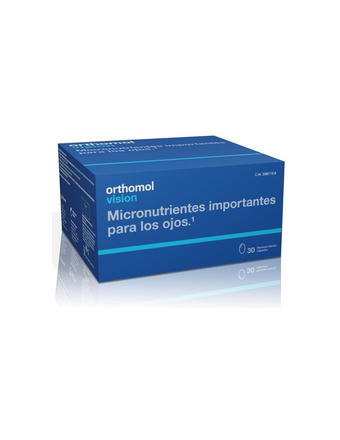 Orthomol® Vision es un complemento alimenticio con micronutrientes importantes para los ojos. La vitamina A, la riboflavina (vitamina B2), el zinc y el ácido graso omega-3 DHA contribuyen al mantenimiento de la visión en condiciones normales. El efecto beneficioso se obtiene con una ingesta diaria de 250 mg de DHA.La vitamina C, la vitamina E, el zinc y el selenio contribuyen a la protección de las células frente al daño oxidativo. La tiamina (vitamina B1) contribuye al metabolismo energético normal. La tiamina (vitamina B1), la riboflavina (vitamina B2), la vitamina B6, la vitamina B12, la vitamina C, la biotina y la niacina contribuyen al funcionamiento normal del sistema nervioso (incluyendo el nervio óptico).Composición activa por 3 cápsulas: