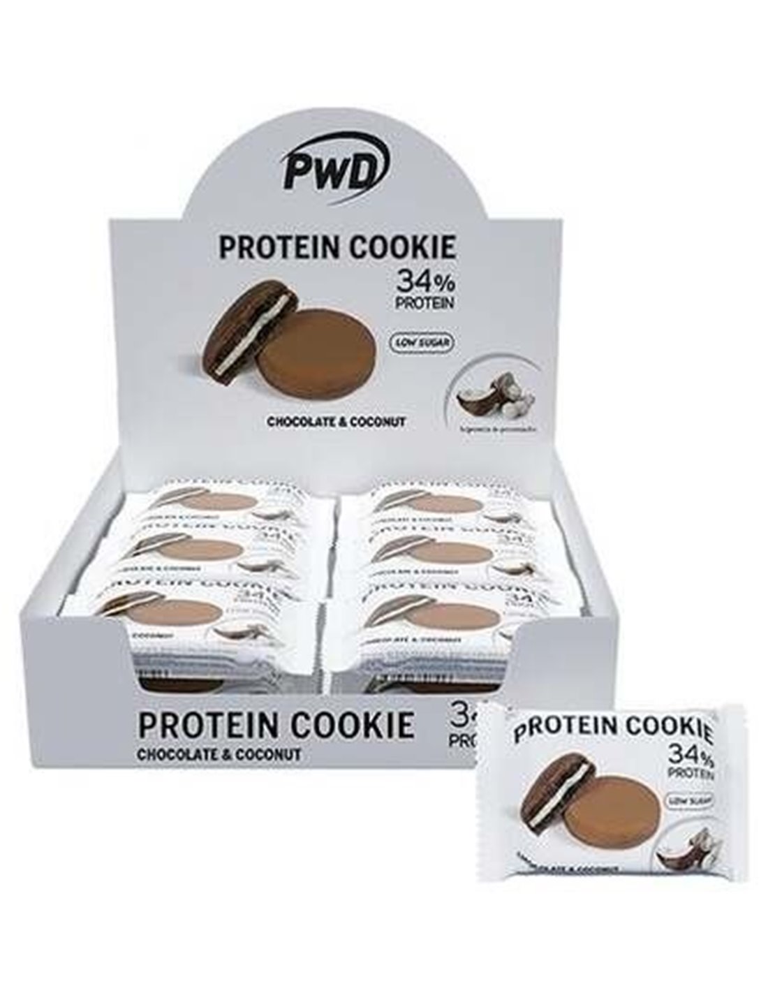 PWDGalletas rellenas de coco y con cobertura de chocolate con leche. Un snack saciante apto para dietas de control de peso. Con una composición alta en proteínas ya que llegan hasta un 34% y muy baja en azúcares ya que estos no superan los 0,7g. por galleta.