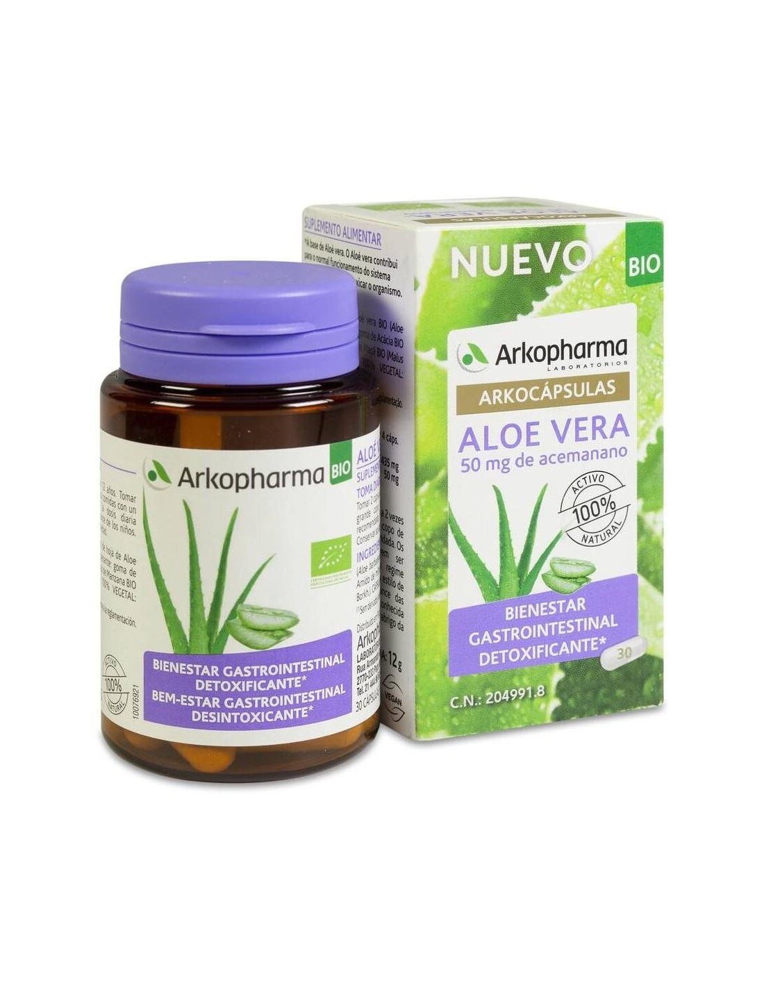 ARKOPHARMAArkocápsulas® Aloe Vera BIO, es una fórmula 100% vegetal. Complemento alimenticio a base de Aloe vera, que contribuye al funcionamiento normal del sistema digestivo, gracias a su acción sobre las mucosas gastrointestinales, y a detoxificar el organismo. A partir de 12 años. Apto para veganos y mujeres embarazadas o en periodo de lactancia.