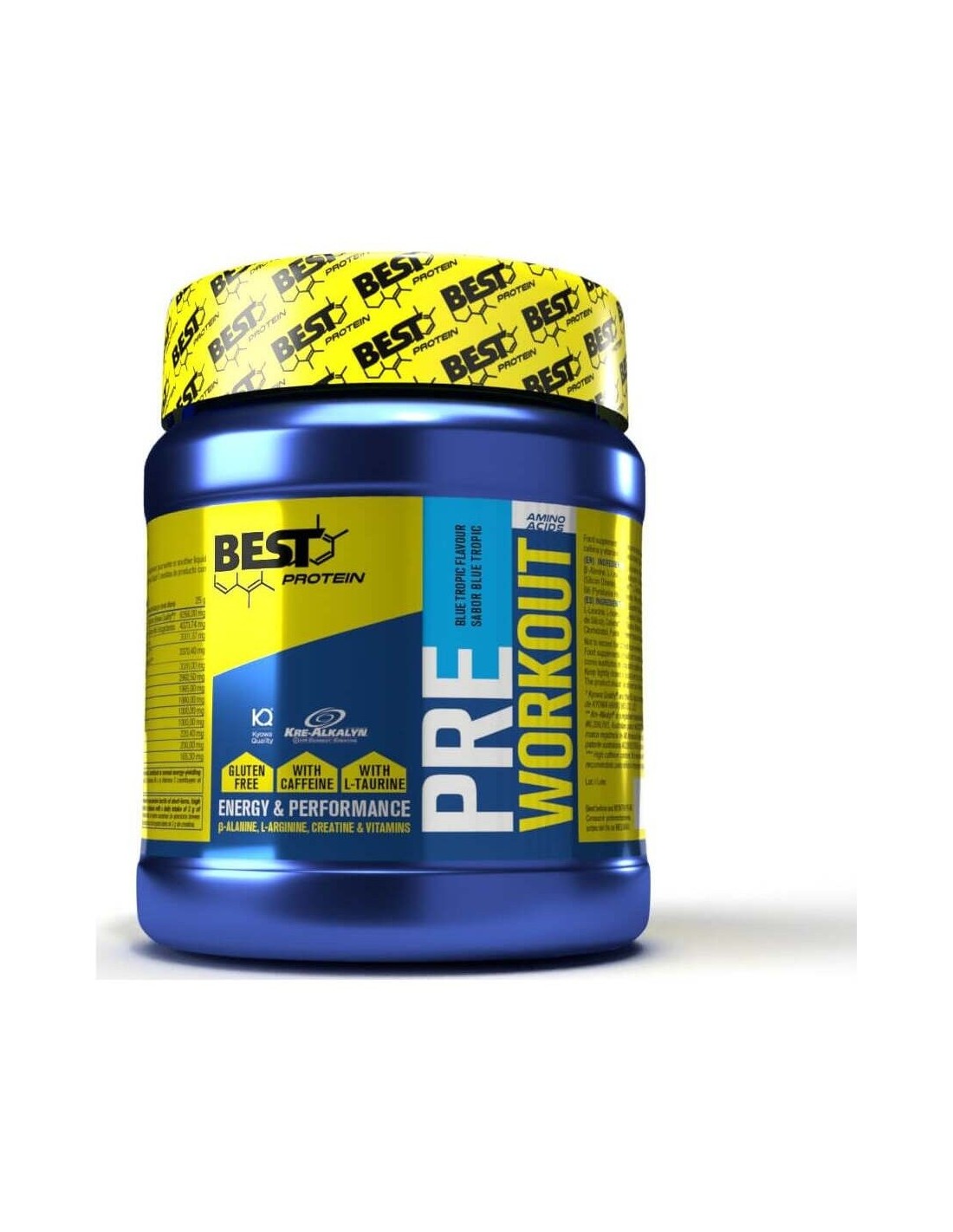 BEST PROTEINPRE WORKOUT es una fórmula que contiene cafeína, monohidrato de creatina CREAPURE®, beta-alanina y aminoácidos ramificados (BCAA) entre otros aminoácidos, ingredientes que ayudan a aportar la energía necesaria antes del entrenamiento y a reducir la fatiga tras realizar un ejercicio intenso. La Niacina (vitamina B3) / la vitamina B6 y la Vitamina C contribuyen al metabolismo energético normal. La creatina apoya el rendimiento físico en series sucesivas de ejercicios breves de alta intensidad. El efecto beneficioso se obtiene con una ingesta diaria de 3 g de creatina.